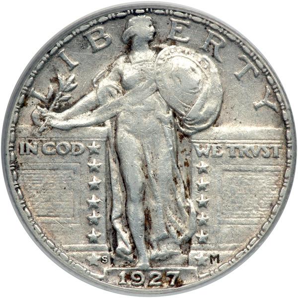 1927-S Liberty Standing Quarter Dollar. PCGS Genuine, surface damage. Our grade is VF-35. A scarce date: 396,000 minted (PCGS # 5764) .