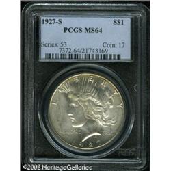 <B>1927-S<img border='0' src='http://www.heritagecoins.com/images/star.gif' width=10 height=10>$1 MS64 PCGS.</B></I> Typically struck with full, frosty luster, sparkling surfaces that display a somewhat glassy appearance in the fields, and scattered milky toning which is seen most prominently on the left side of the obverse. A near-Gem example of this scarce, semi-key issue. Lot:10722
