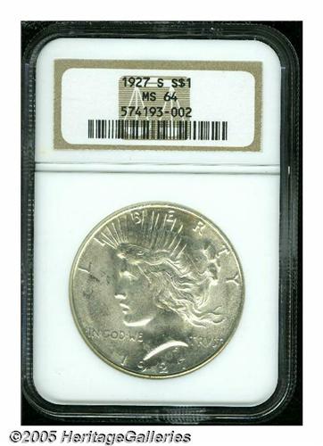 <B>1927-S<S$1> MS64 NGC.</B></I> Bright satin luster and traces of scattered milky coloration are the rule on both sides of this rather flashy near-Gem. Very few contact marks or luster grazes seem evident on the well preserved surfaces. The 1927-S has the third lowest mintage in the series, with only 866,000 pieces produced, and becomes scarce above the MS64 grade level.