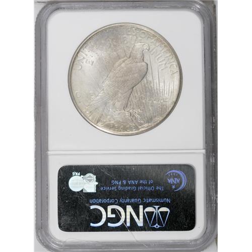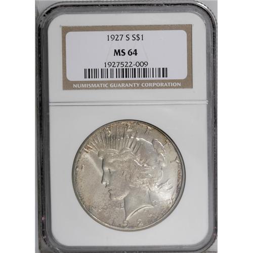 <B>1927-S<img border='0' src='http://www.heritagecoins.com/images/star.gif' width=10 height=10>$1> MS64 NGC.</B></I> This coin has an overall faint gold-olive patina with streaks and patches of russet and dark magenta. Slight striking weakness is nothing new for this issue, and this coin is a good representative.