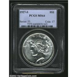 1927-S S$1 MS64 PCGS. A boldly struck and brilliant near-Gem that has clean surfaces and intense luster. One of just three Peace Dollar issues to have a mintage below 1 million pieces. Important notice: We expect to be auctioning lots at the rate of 200-250 per hour. Sometimes eBay Premier live bid software cannot keep up with that pace, so we strongly recommend that you place a realistic proxy bid now as insurance to avoid disappointment. Also please note that all Heritage/CAA lots purchased through eBay Premier carry a 20% Buyer's Premium. Please make sure you read the Terms and Conditions.