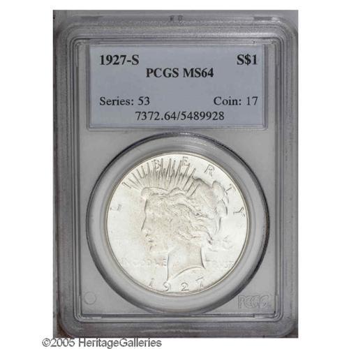 1927-S S$1 MS64 PCGS. A light sprinkling of golden-bro 1927-S[S$1] MS64 PCGS.