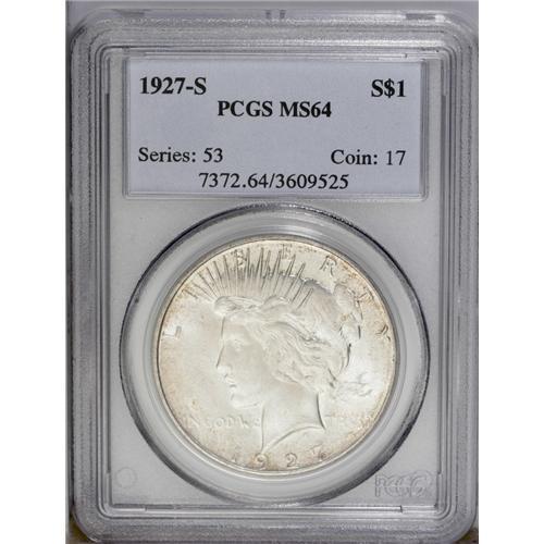 <B>1927-S<img border='0' src='http://www.heritagecoins.com/images/star.gif' width=10 height=10>$1> MS64 PCGS.</B></I> Luster illuminates the carefully preserved and lightly toned gray-gold surfaces. The strike is above average for the mint.<BR><I>From The David L. Goodwin Collection.</B></I> <BR><BR><B>Important notice:</B> Heritage usually auctions material at the rate of 200-250 lots per hour. On some occasions eBay Live bid software or the Internet may not be able to keep up with the pace of the auction. We recommend placing a realistic absentee bid now as insurance to avoid disappointment. Occasionally the auctioneer may eliminate or reject an eBay Live bid, and the auctioneer may also reopen a lot after the close of the eBay live bidding (usually because we missed an audience bid), and may reject your bid even if it shows you as the winning bidder. By bidding via eBay Live, you agree that Heritage may award the lot to another bidder at its sole discretion under the circumstances described above or any other reasonable circumstances. Since eBay bids are not shown to us until we open the lot on the floor, we treat those bids just like floor bids. In most cases the floor responds before the eBay bid is presented to us, due to Internet lag time, so for consistency we have made it a policy that floor bids are always considered first over tie eBay live bids. Also please note that all Heritage lots purchased through eBay Live carry a 20% Buyer's Premium. Please make sure you read the Terms and Conditions before you bid. This lot is being auctioned in conjunction with a live floor auction by Heritage Galleries & Auctioneers. All final auction and invoice information will be supplied by Heritage Galleries & Auctioneers, and all other information should be considered preliminary. Lot:3856 <BR><BR><B>Winning Notification and Billing:</B> After the FINAL session in this auction is complete, Heritage will send e-mail and snail mail invoices. This process normally takes several days. All final auction and invoice information will be supplied by Heritage Galleries & Auctioneers, and all other information should be considered preliminary. <BR><BR>This auction will be conducted on a live auction floor and over the Internet through eBay Live. If you choose to place an absentee bid, please take a moment to <font color='#0000ff'><u><a href='http://pages.ebay.com/liveauctions/help/before/laabsentee.html'>learn how eBay Live absentee bidding works</a></u></font><font color='#000000'>