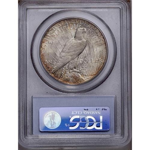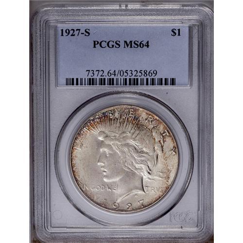 <B>1927-S<img border='0' src='http://www.heritagecoins.com/images/star.gif' width=10 height=10>$1> MS64 PCGS.</B></I> Mottled reddish-brown and green coloration occur near the obverse and reverse peripheries. Boldly struck with substantial luster and a few wispy marks near the untoned silver-gray centers. The semi-key 1927-S has the third-lowest mintage in the series.