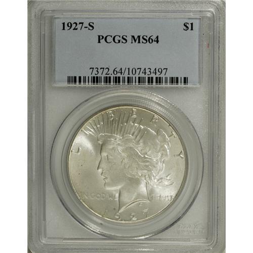 <B>1927-S S$1 MS64 PCGS.</B></I> This pleasing near-Gem is untoned, with highly lustrous silver-gray surfaces that have an unusual degree of "flash" for a Peace dollar. A few small marks limit the grade, most of which are on the eagle. The specialist will recognize this as a lower mintage semikey date in the series.<BR><BR><b>Shipping:</b> Coins & Currency (<a target="_blank" href="http://www.heritageauctions.com/common/shipping.php">view shipping information</a>)
