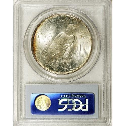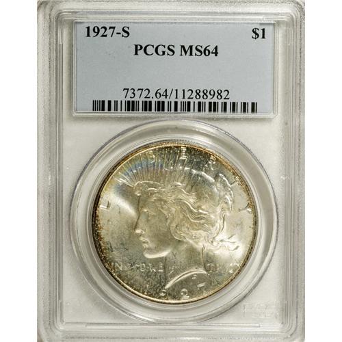 <B>1927-S S$1 MS64 PCGS.</B></I> Well struck with splashes of amber-gold and ice-blue toning. A few marks are present on Liberty's jaw, and a scrape affects the G and O of GOD.<BR><BR><b>Shipping:</b> Coins & Currency (<a target="_blank" href="http://www.heritageauctions.com/common/shipping.php">view shipping information</a>)