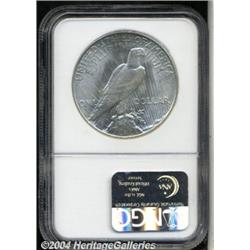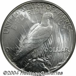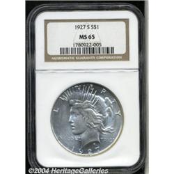 <B>1927-S<S$1> MS65 NGC.</B></I> The 1927-S can claim the third lowest mintage in the Peace Dollars series, a mere 866,000 pieces. Its low production not only makes is a popular issue among Silver Dollar collectors, the '27-S is also a significant condition rarity that is infrequently offered as a Gem. This bright, satiny-white example is particularly well struck for the issue and has escaped all but the most insignificant contact marks. A large area of die polish is noted in the left obverse field. <BR><BR><B>Important notice:</B> Heritage usually auctions material at the rate of 200-250 lots per hour. On some occasions eBay Live bid software or the Internet may not be able to keep up with the pace of the auction. We recommend placing a realistic absentee bid now as insurance to avoid disappointment. Occasionally the auctioneer may eliminate or reject an eBay Live bid, and the auctioneer may also reopen a lot after the close of the eBay live bidding (usually because we missed an audience bid), and may reject your bid even if it shows you as the winning bidder. By bidding via eBay Live, you agree that Heritage may award the lot to another bidder at its sole discretion under the circumstances described above or any other reasonable circumstances. Since eBay bids are not shown to us until we open the lot on the floor, we treat those bids just like floor bids. In most cases the floor responds before the eBay bid is presented to us, due to Internet lag time, so for consistency we have made it a policy that floor bids are always considered first over tie eBay live bids. Also please note that all Heritage lots purchased through eBay Live carry a 20% Buyer's Premium. Please make sure you read the Terms and Conditions before you bid. </span></font></tr></table></td></tr></table>