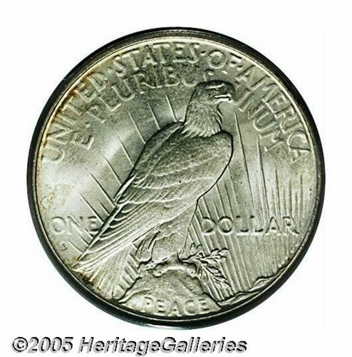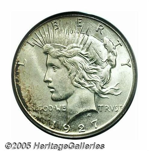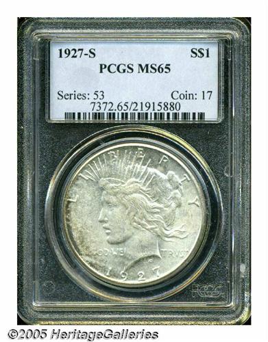 <B>1927-S<S$1> MS65 PCGS.</B></I> The 1927-S has the third lowest mintage in the series with only 866,000 pieces produced. It is also a significant condition rarity that is infrequently offered in Gem condition. This sharply struck example has smooth surfaces with flashy mint luster and no mentionable abrasions on either side. A smattering of deep patina gravitates toward selected border areas. Population: 49 in 65, 2 finer (4/05).