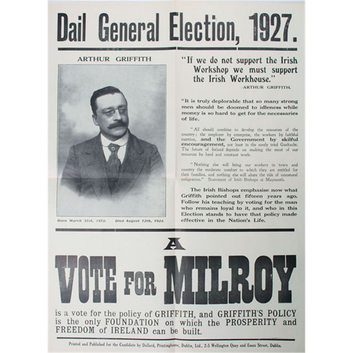 Election poster produced by Seán Milroy with an inset image and quotes of Arthur Griffith. Main title in lower quarter, "A vote for Milroy is a vote for the policy of Griffith and Griffith's policy is the only foundation on which the prosperity and freedom of Ireland can be built". Seán Milroy unsuccessfully contested the Cavan constituency during the 1927 General Election as an independent candidate after leaving Cumann na nGaedheal. He was later elected to Seanad Éireann.