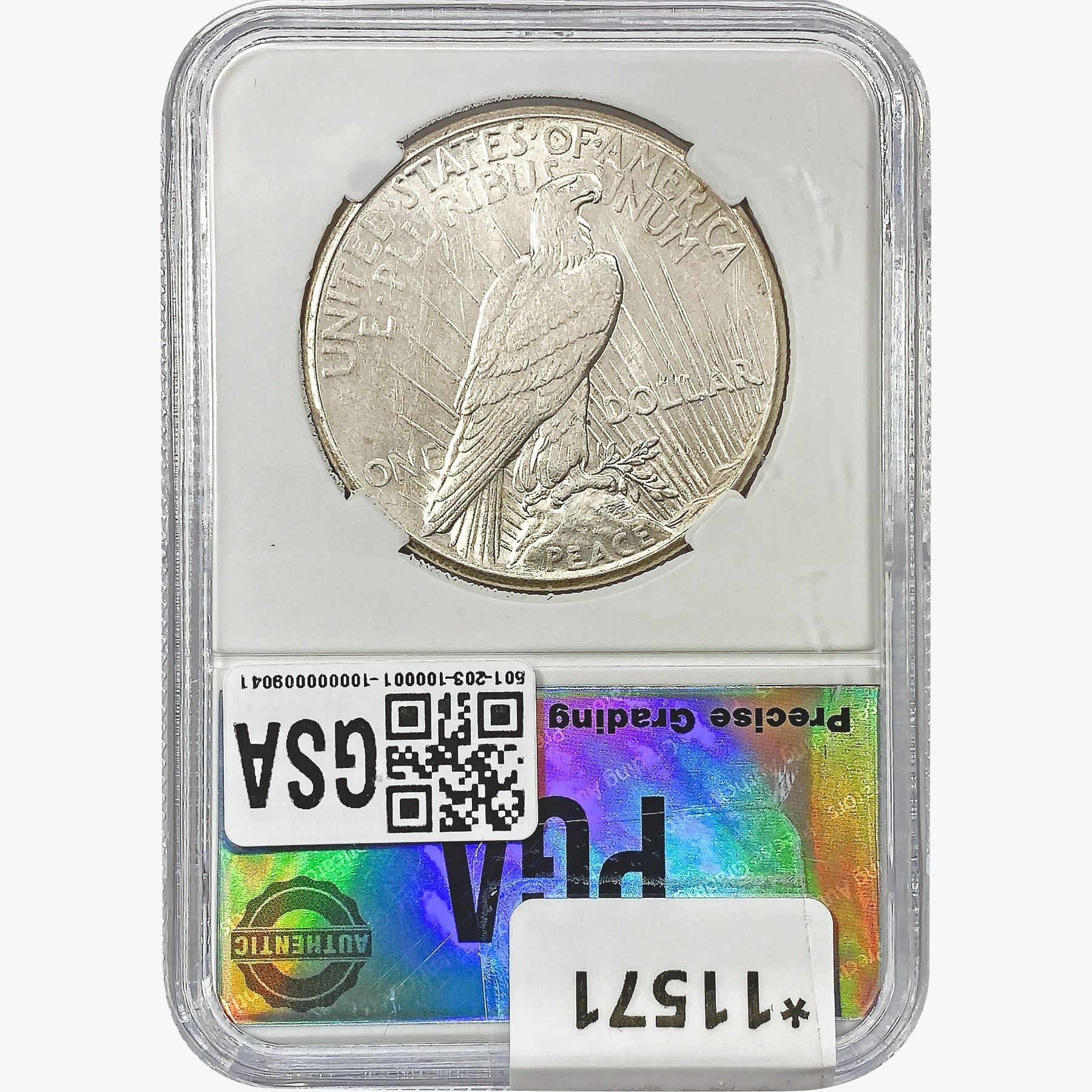 COINS AND CURRENCY LISTED IN GSA’S CATALOG AS GRADED AND ENCAPSULATED BY PCGS, NGC, ANACS, ICG, PCGS CURRENCY, PMG, PCGS BANKNOTE GRADING, CMC OR ANY OTHER THIRD-PARTY GRADING SERVICE ARE LIKEWISE SOLD “AS-IS” EXCEPT AS EXPRESSLY SET FORTH HEREIN. ALL THIRD-PARTY GRADING SERVICE GUARANTEES, INCLUDING AUTHENTICITY, ARE THE SOLE RESPONSIBILITY OF THE THIRD-PARTY GRADING SERVICE AND NOT WARRANTIES OR GUARANTEES OF GSA. BIDDERS SHOULD CONTACT THESE THIRD-PARTY GRADING SERVICES DIRECTLY WITH RESPECT TO ANY CLAIMS OR QUESTIONS THEY MAY HAVE CONCERNING THEIR GUARANTEES AND WARRANTIES. BIDDERS ACKNOWLEDGE AND AGREE THAT AUCTIONEER IS NOT BOUND BY OR LIABLE FOR ANY OPINION OR CERTIFICATION BY ANY THIRD-PARTY GRADING SERVICE. REMOVAL OF A PRODUCT FROM ITS PROTECTIVE CASING OR HOLDER OR ALTERATION OF ANY COIN HOLDER WAIVES ALL RIGHTS CONCERNING THE PRODUCT CONTAINED THEREIN.