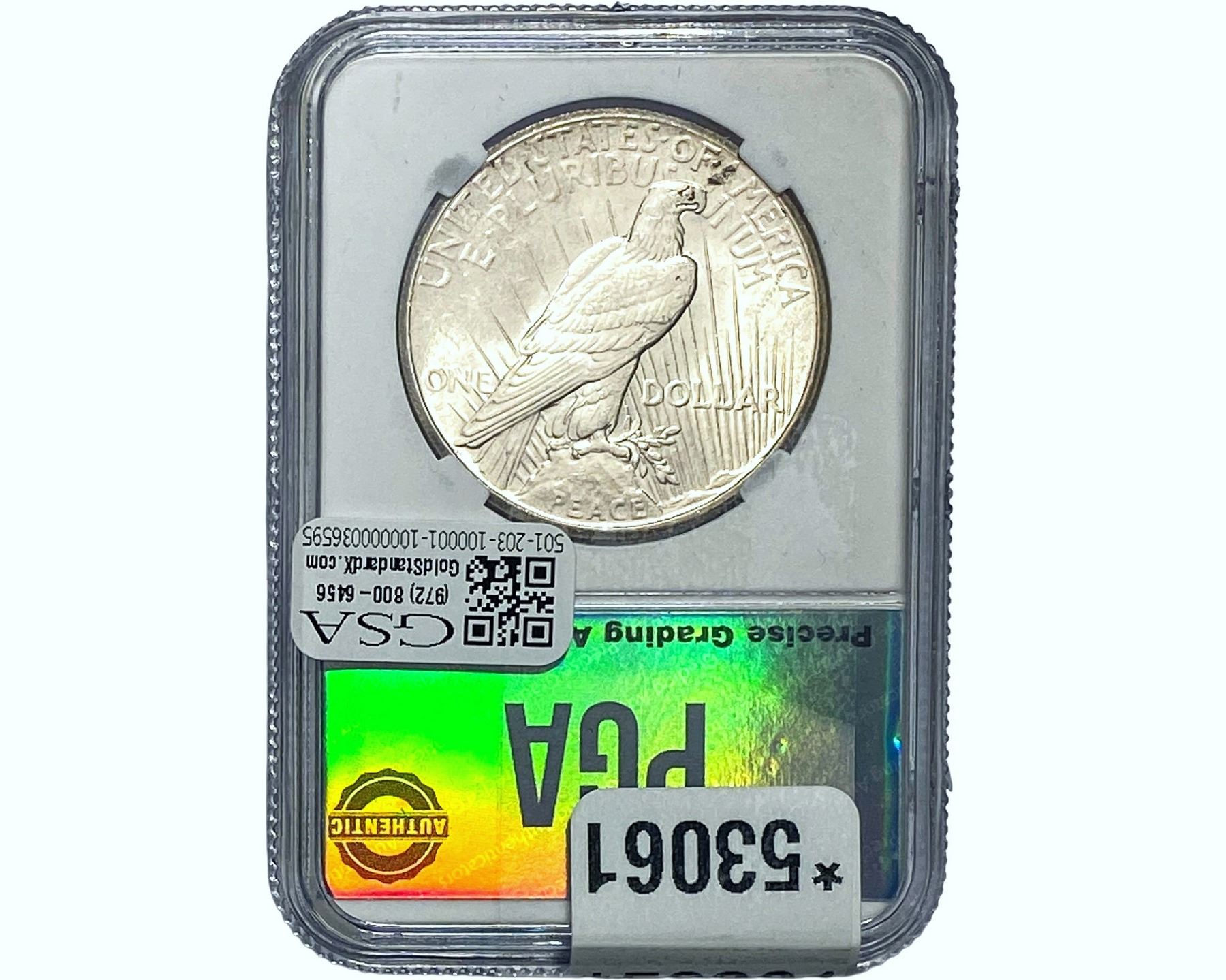 l. All non-certified coins and currency are guaranteed genuine, but are not guaranteed as to grade, since grading is a matter of opinion, an art and not a science, and therefore the description rendered by GSA or any third-party grading service may not agree with the opinion of others (including trained experts), and the same expert may not grade the same item with the same grade at two different times. GSA may, but is not obligated to, express an opinion as to non-certified numismatic items, in GSA’s opinion, or by its employees’ experience and the current interpretation of the American Numismatic Association’s standards as of the date the catalog was prepared. There is no guarantee or warranty expressed or implied that the grading opinions utilized by GSA, if any, will meet the standards of any grading service at any time in the future.