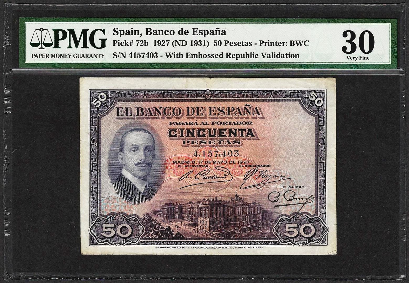 1927 Spain Banco de Espana 50 Pesetas Note Pick# 72b PMG Very Fine 30