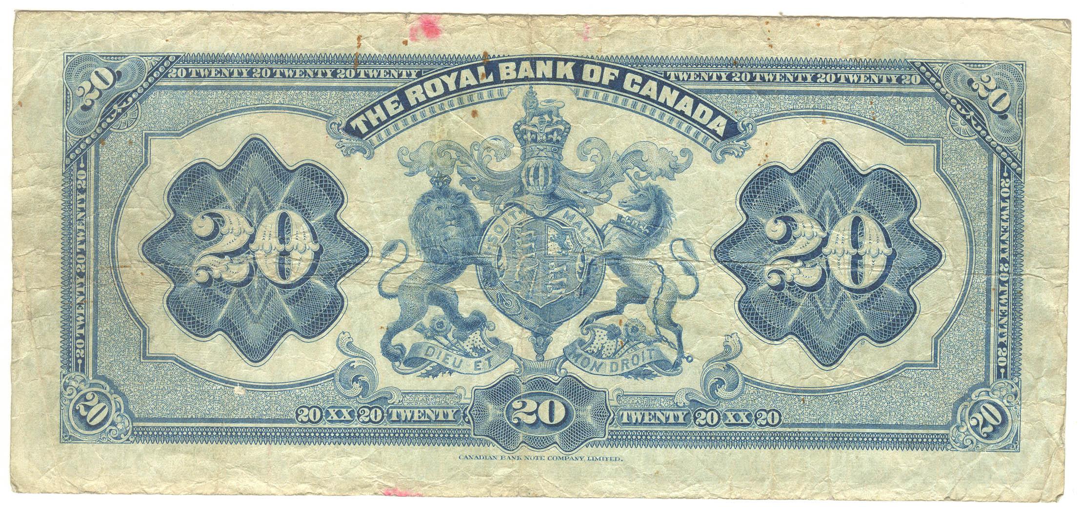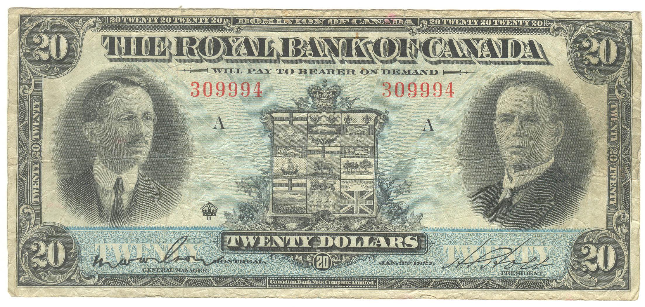 1927 Twenty Dollars Royal Bank of Canada, Fine, CH 630-14-12, Wilson Holt, Letter A, serial 309994.