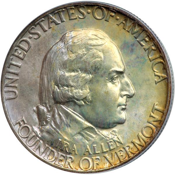 1927 Vermont Half Dollar. PCGS graded MS-66+. Lovely natural toning on both sides. Stored in a Raymond folder for over 60 years. Pop 4; 21 finer in 67 (PCGS # 9401) .