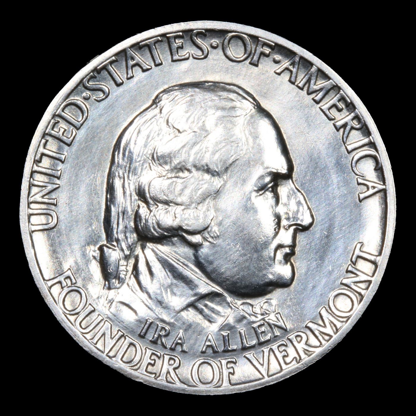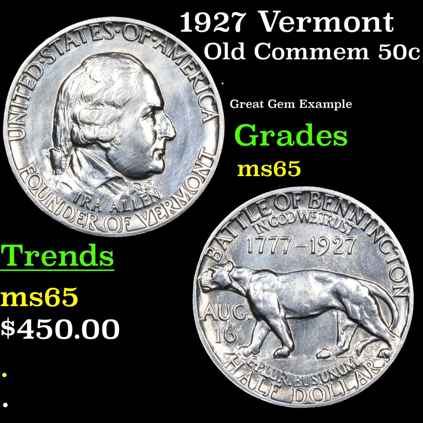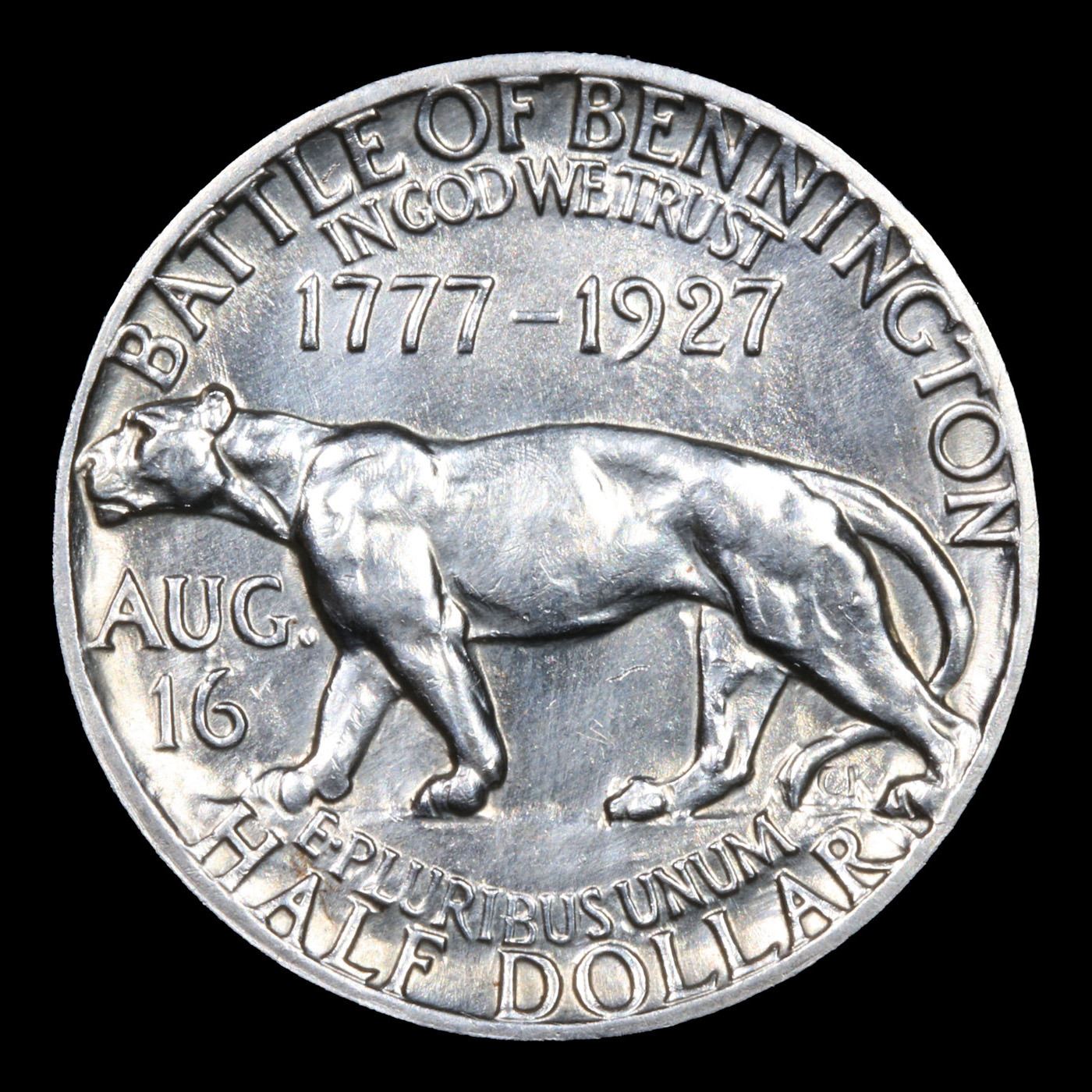 1927 Vermont Old Commem Half Dollar 50c Grades GEM Unc. The 1927 Vermont Sesquicentennial Half Dollar was issued to commemorate the 150th anniversary of the Battle of Bennington and the independence of Vermont. This occurred in 1777, and it was not until 1791 that Vermont would join the Union.Designs for the coin were by Charles Keck, who had earlier create the design for the Panama-Pacific Gold Dollar. His design for the 1927 Vermont Half Dollar was executed in the highest relief of any early commemorative half dollar issued. The obverse of the coin depicts Ira Allen, the founder of Vermont and one of the Green Mountain Boys, who would defeat the British at the Battle of Bennington.The design for the reverse of the coin was a point of contention for those involved in the design process. Other possibilities had included an image of the Bennington Monument obelisk and an image of the Catamount Tavern where the Green Mountain Boys would meet. It was eventually decided that the image of a catamount would represent be more appropriate as a representation of the tavern. The original issue price for the Vermont Sesquicentennial Half Dollar was $1, with sales conducted by the Bennington Battle Monument and Historical Association. Out of the maximum authorized mintage of 40,000 pieces, a total of 28,142 were distributed and the rest were returned to the Mint for melting. Most of the Mintage were Sold to Vermont Residents and Non-Numismatists and therefore were Improperly Handled and Many Show Wear. When Examining a Vermont Commemorative, Points to Check for Wear include Ira Allen’s Cheek and the Hair at his Temple; on the Reverse, Examine the Uppermost Part of the Cat’s Foreleg and its Hip.