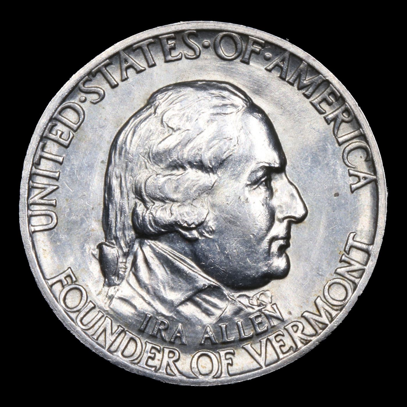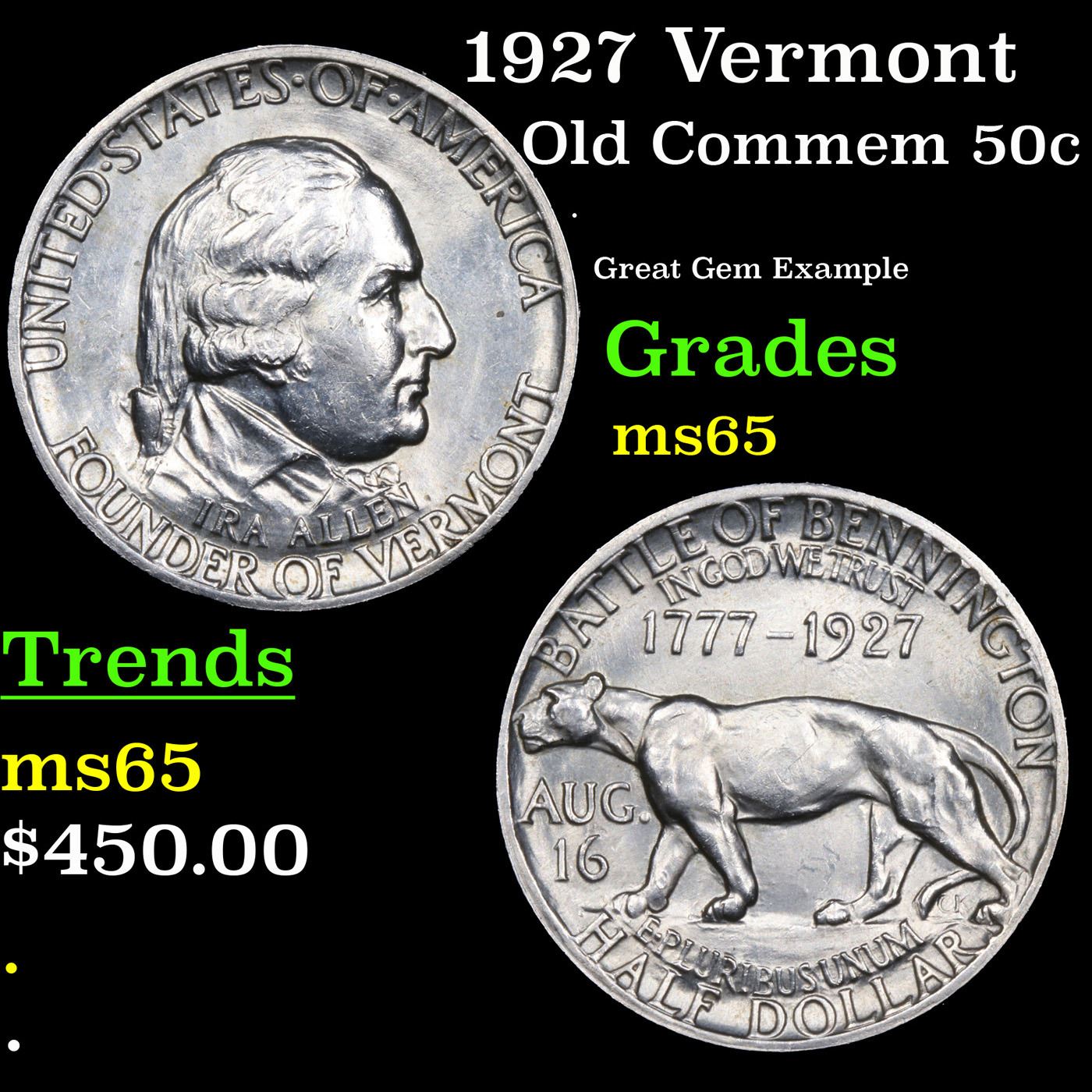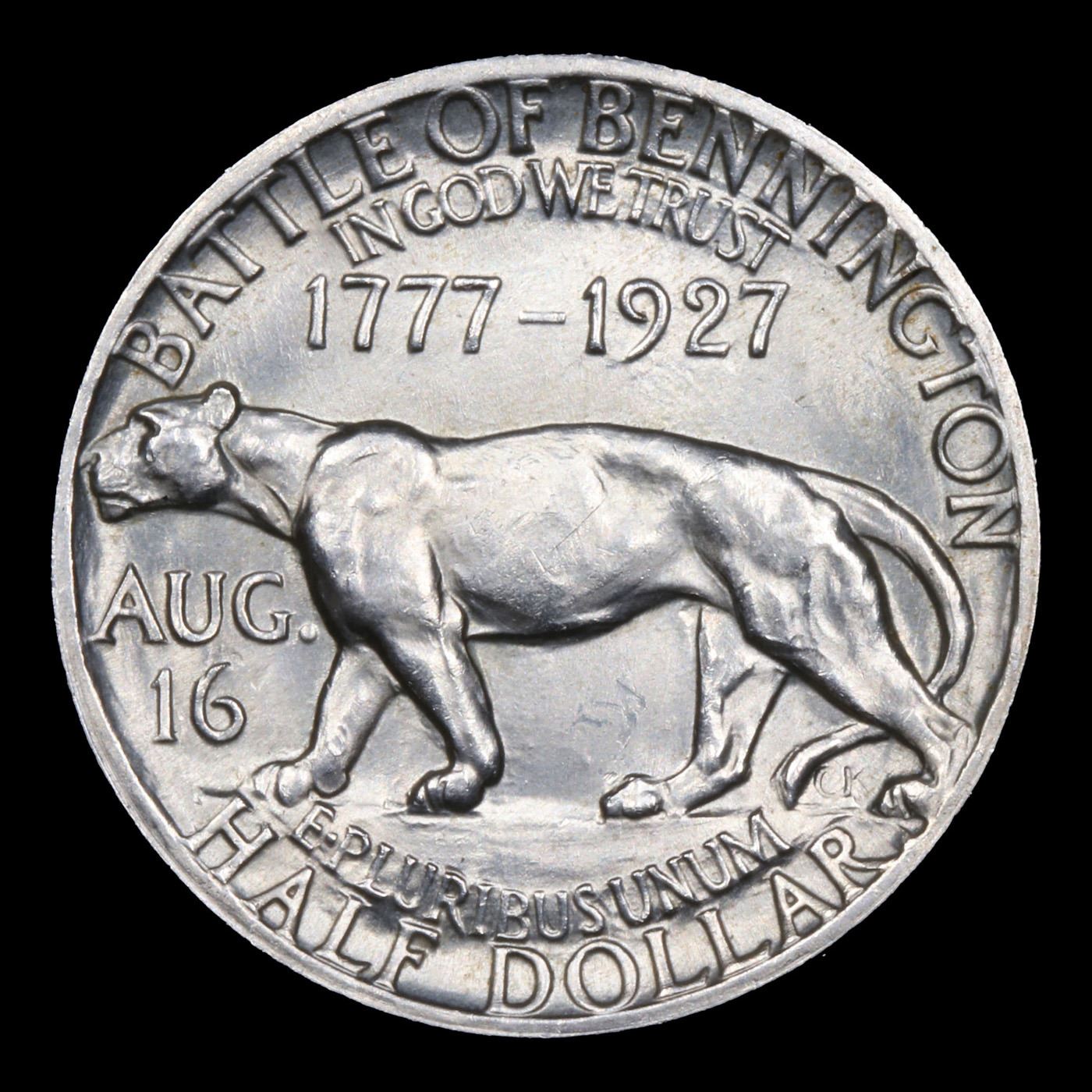 1927 Vermont Old Commem Half Dollar 50c Grades GEM Unc. The 1927 Vermont Sesquicentennial Half Dollar was issued to commemorate the 150th anniversary of the Battle of Bennington and the independence of Vermont. This occurred in 1777, and it was not until 1791 that Vermont would join the Union.Designs for the coin were by Charles Keck, who had earlier create the design for the Panama-Pacific Gold Dollar. His design for the 1927 Vermont Half Dollar was executed in the highest relief of any early commemorative half dollar issued. The obverse of the coin depicts Ira Allen, the founder of Vermont and one of the Green Mountain Boys, who would defeat the British at the Battle of Bennington.The design for the reverse of the coin was a point of contention for those involved in the design process. Other possibilities had included an image of the Bennington Monument obelisk and an image of the Catamount Tavern where the Green Mountain Boys would meet. It was eventually decided that the image of a catamount would represent be more appropriate as a representation of the tavern. The original issue price for the Vermont Sesquicentennial Half Dollar was $1, with sales conducted by the Bennington Battle Monument and Historical Association. Out of the maximum authorized mintage of 40,000 pieces, a total of 28,142 were distributed and the rest were returned to the Mint for melting. Most of the Mintage were Sold to Vermont Residents and Non-Numismatists and therefore were Improperly Handled and Many Show Wear. When Examining a Vermont Commemorative, Points to Check for Wear include Ira Allen’s Cheek and the Hair at his Temple; on the Reverse, Examine the Uppermost Part of the Cat’s Foreleg and its Hip.