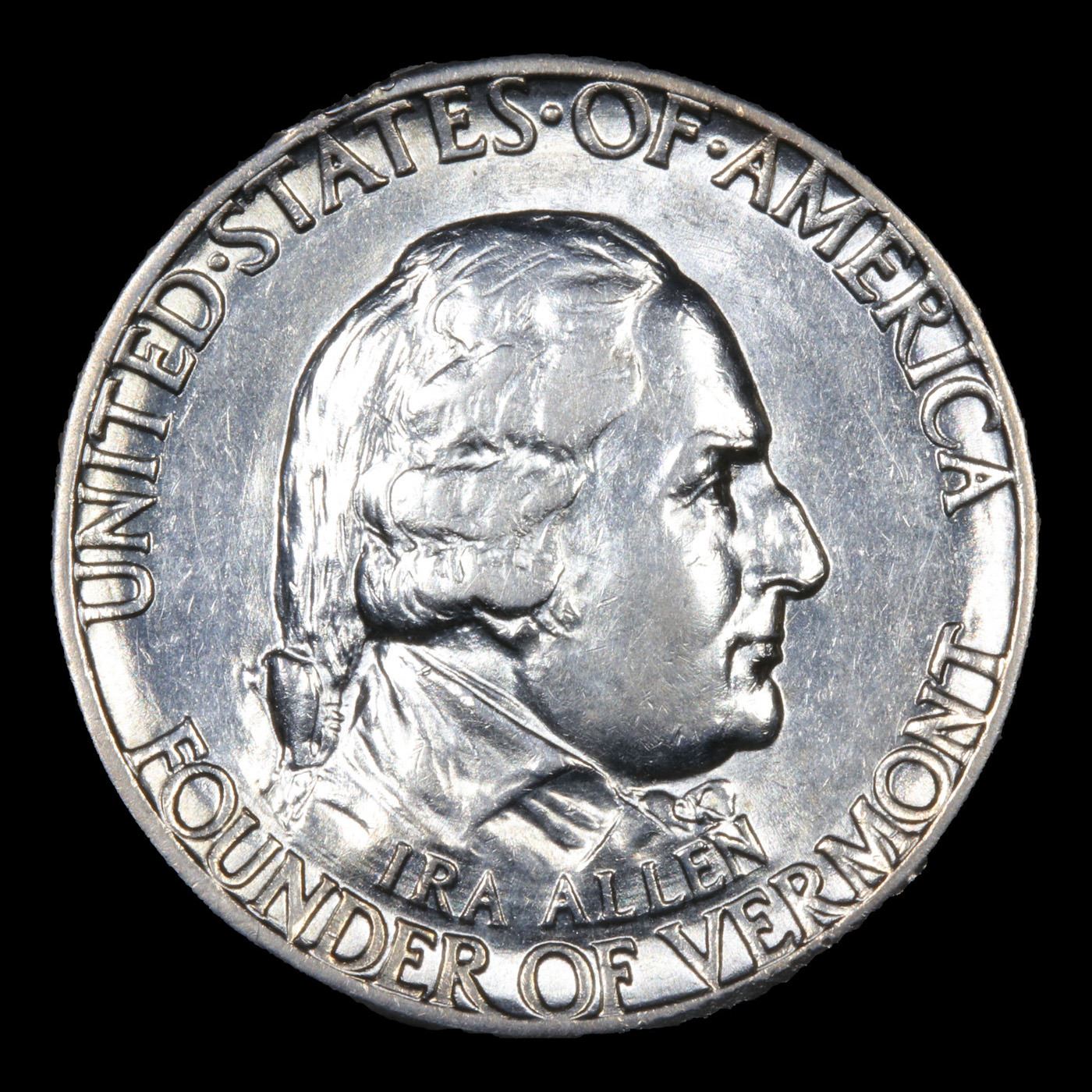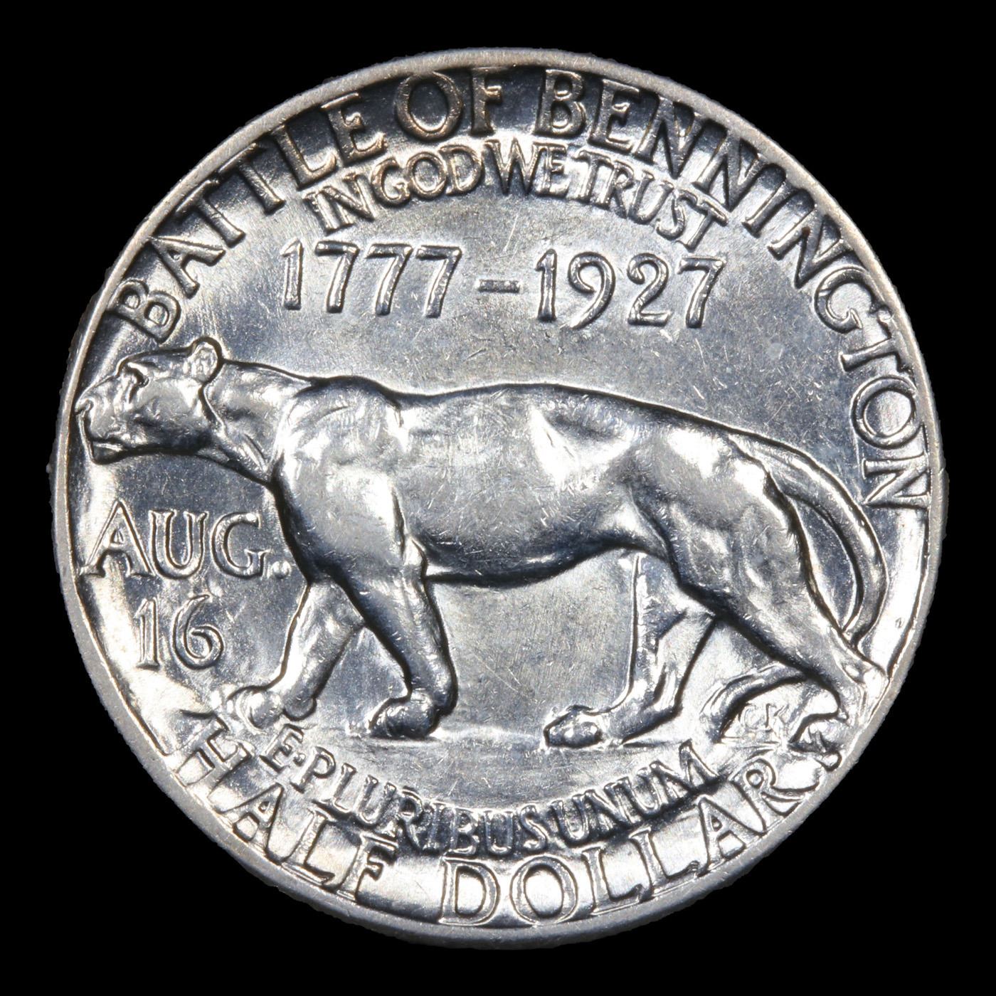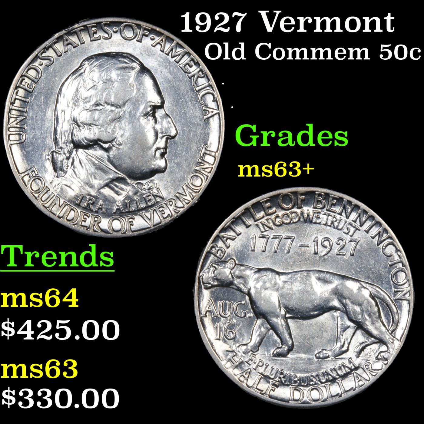 1927 Vermont Old Commem Half Dollar 50c Grades Select+ Unc. This is a Very Scarce Commemorative. Most of the Original Mintage of 28,000 Pieces were Sold to Vermont Residents and Non-Numismatists and therefore were Improperly Handled and Many Show Wear. When Examining a Vermont Commemorative, Points to Check for Wear include Ira Allen’s Cheek and the Hair at his Temple; on the Reverse, Examine the Uppermost Part of the Cat’s Foreleg and its Hip. The 1927 Vermont Sesquicentennial Half Dollar was issued to commemorate the 150th anniversary of the Battle of Bennington and the independence of Vermont. This occurred in 1777, and it was not until 1791 that Vermont would join the Union.Designs for the coin were by Charles Keck, who had earlier create the design for the Panama-Pacific Gold Dollar. His design for the 1927 Vermont Half Dollar was executed in the highest relief of any early commemorative half dollar issued. The obverse of the coin depicts Ira Allen, the founder of Vermont and one of the Green Mountain Boys, who would defeat the British at the Battle of Bennington.The design for the reverse of the coin was a point of contention for those involved in the design process. Other possibilities had included an image of the Bennington Monument obelisk and an image of the Catamount Tavern where the Green Mountain Boys would meet. It was eventually decided that the image of a catamount would represent be more appropriate as a representation of the tavern. The original issue price for the Vermont Sesquicentennial Half Dollar was $1, with sales conducted by the Bennington Battle Monument and Historical Association. Out of the maximum authorized mintage of 40,000 pieces, a total of 28,142 were distributed and the rest were returned to the Mint for melting. Most of the Mintage were Sold to Vermont Residents and Non-Numismatists and therefore were Improperly Handled and Many Show Wear. When Examining a Vermont Commemorative, Points to Check for Wear include Ira Allen’s Cheek and the Hair at his Temple; on the Reverse, Examine the Uppermost Part of the Cat’s Foreleg and its Hip.