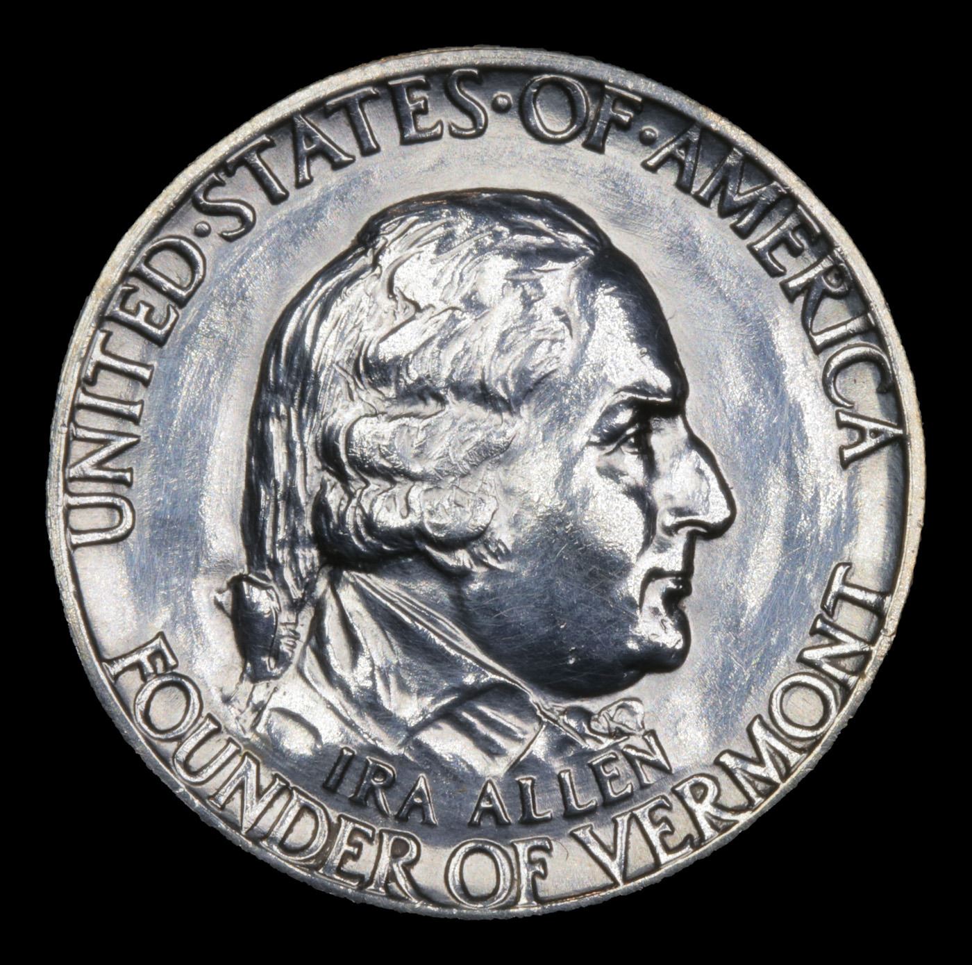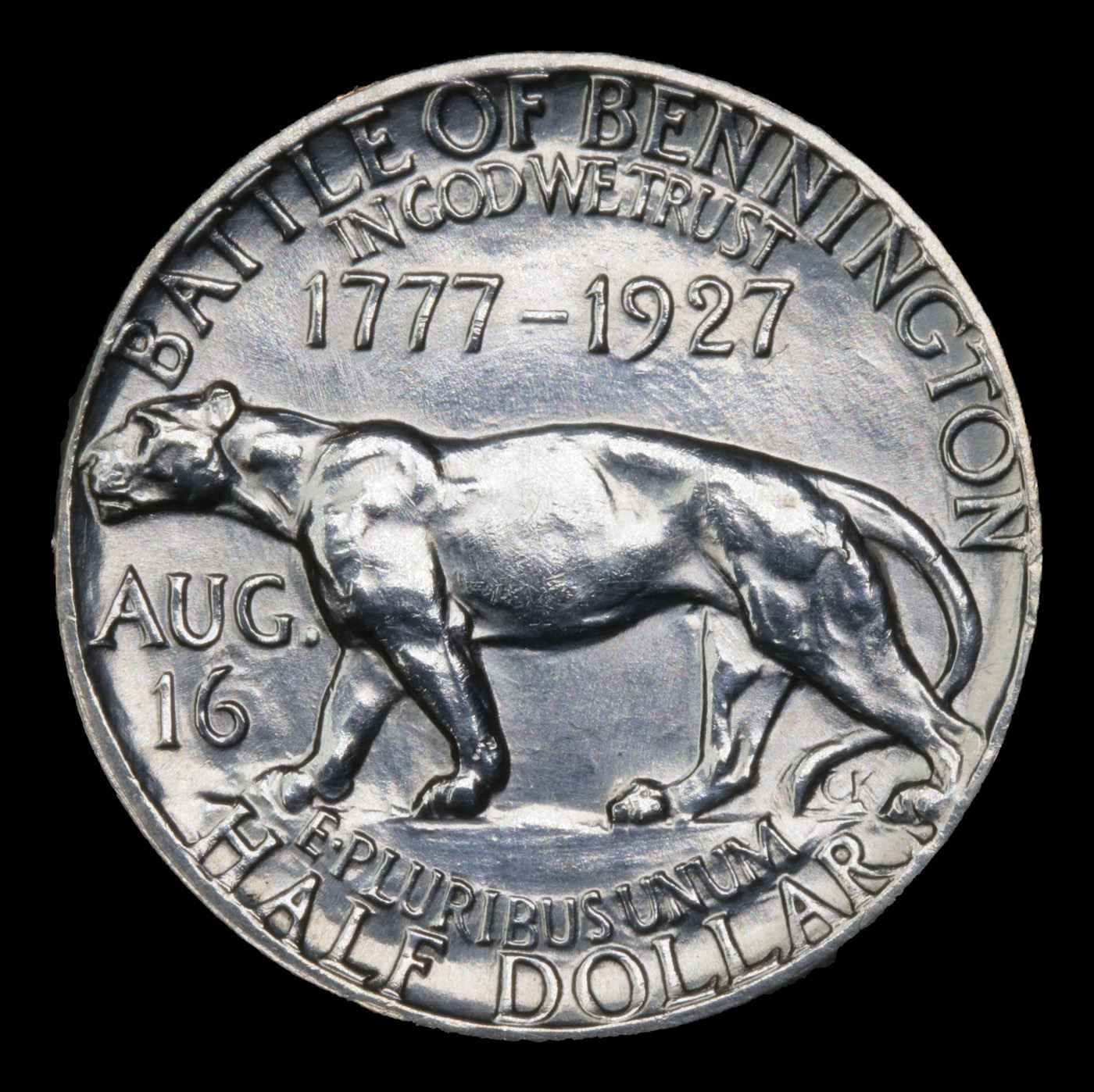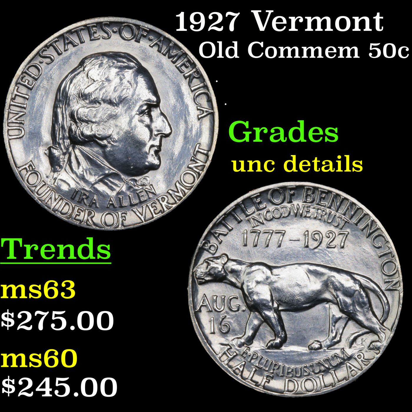 1927 Vermont Old Commem Half Dollar 50c Grades Unc Details. This is a Very Scarce Commemorative. Most of the Original Mintage of 28,000 Pieces were Sold to Vermont Residents and Non-Numismatists and therefore were Improperly Handled and Many Show Wear. When Examining a Vermont Commemorative, Points to Check for Wear include Ira Allen’s Cheek and the Hair at his Temple; on the Reverse, Examine the Uppermost Part of the Cat’s Foreleg and its Hip.