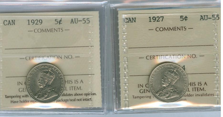 1927 and 1929 5¢. Lot of 2 ICCS graded coins, both ICCS AU55.