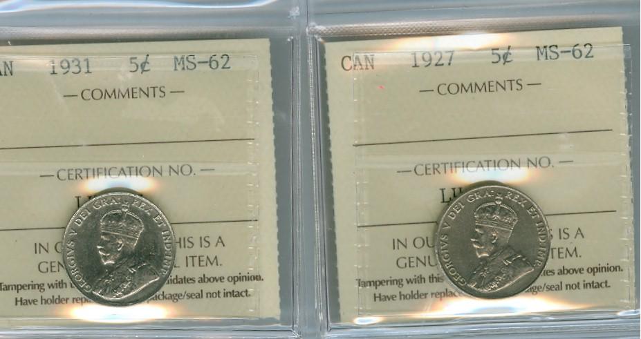1927 and 1931 5¢. Lot of 2 ICCS graded coins, both MS62;