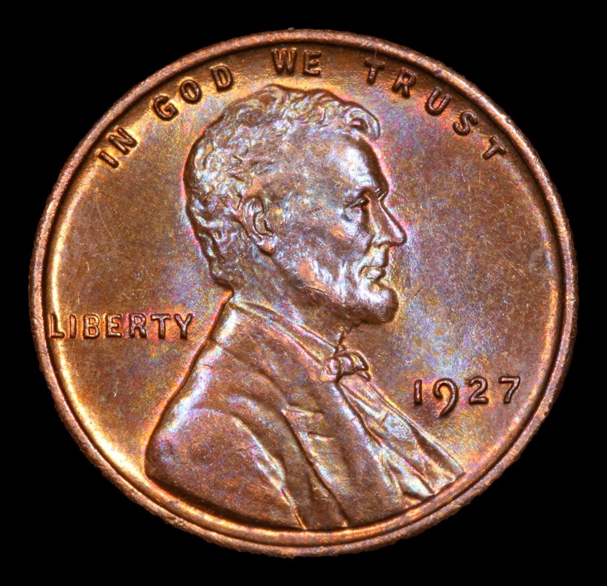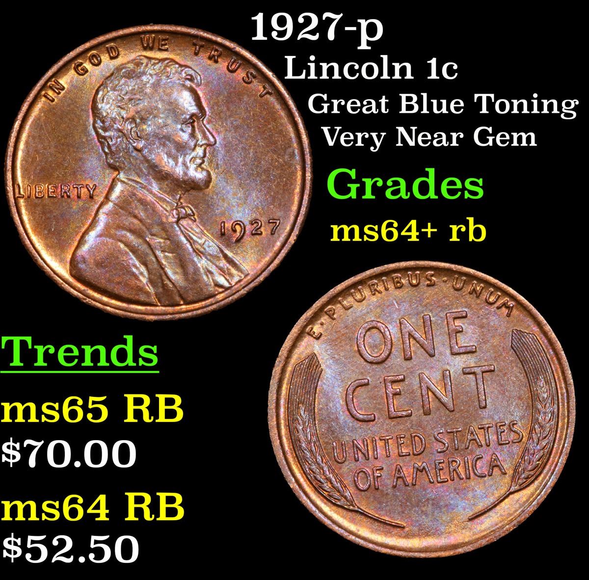1927-p Great Blue Toning Very Near Gem Lincoln Cent 1c Grades Choice+ Unc RB.