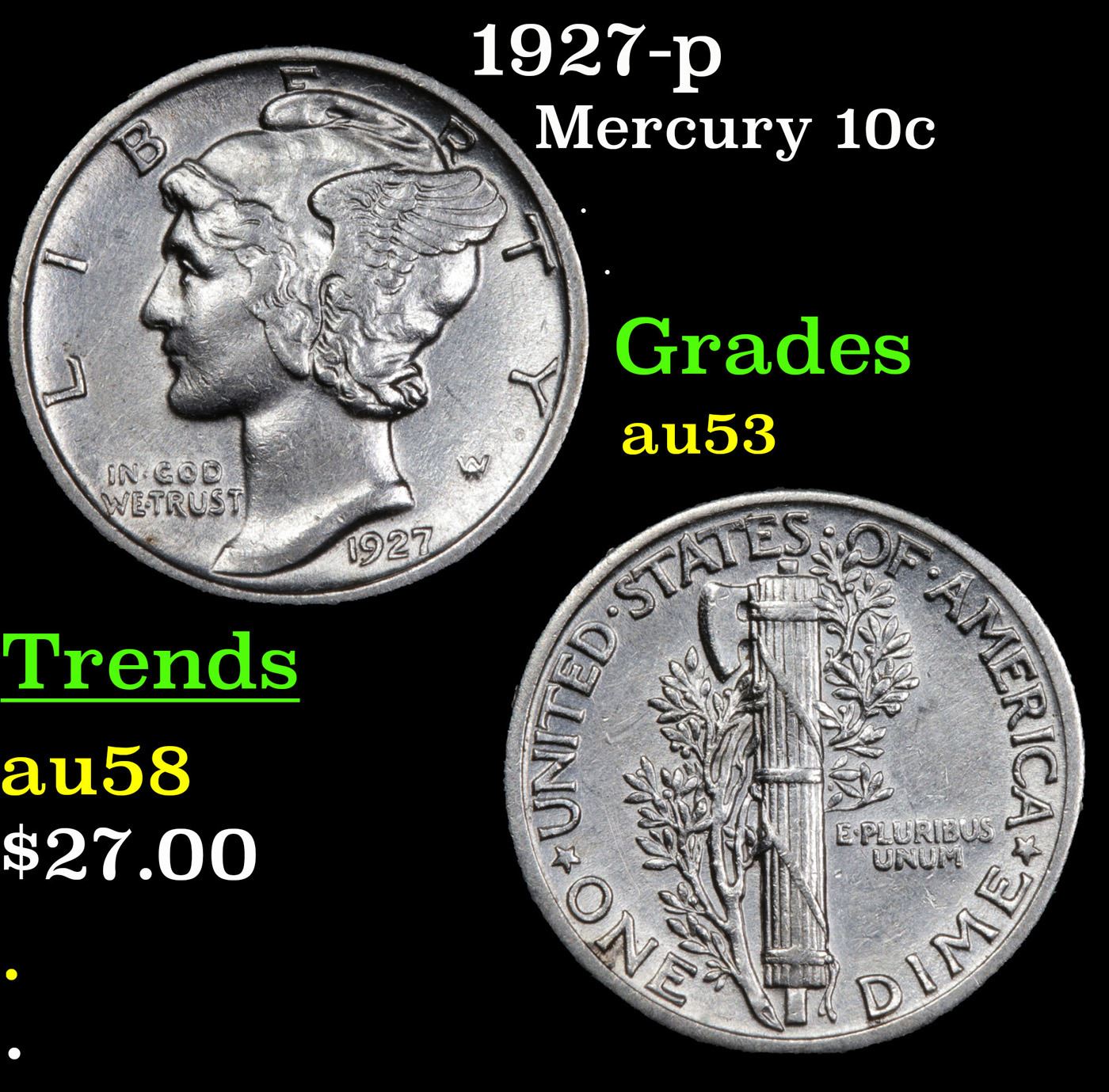 1927-p Mercury Dime 10c Grades Select AU.
