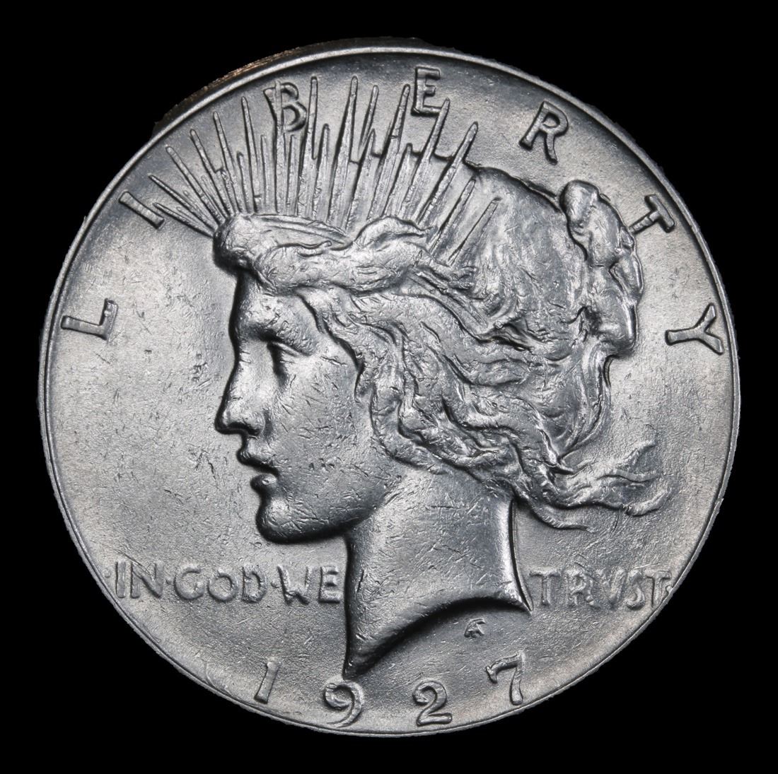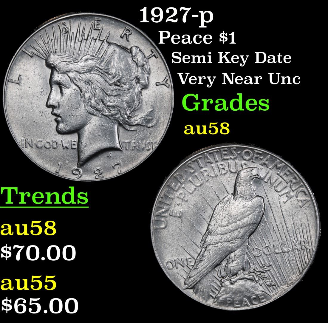 1927-p Semi Key Date Very Near Unc Peace Dollar $1 Grades Choice AU/BU Slider. The 27-p is the big sleeper of numismatics in my opinion. It has the 2nd lowest mintage in the whole Peace dollar series. Lower than the 34-s, the 21-p, yet it does not command its proper value. Good coin to own multiple of and save, in my opinion, but if you've been coming to our auctions for a while you will have seen that this has always been my opinion.