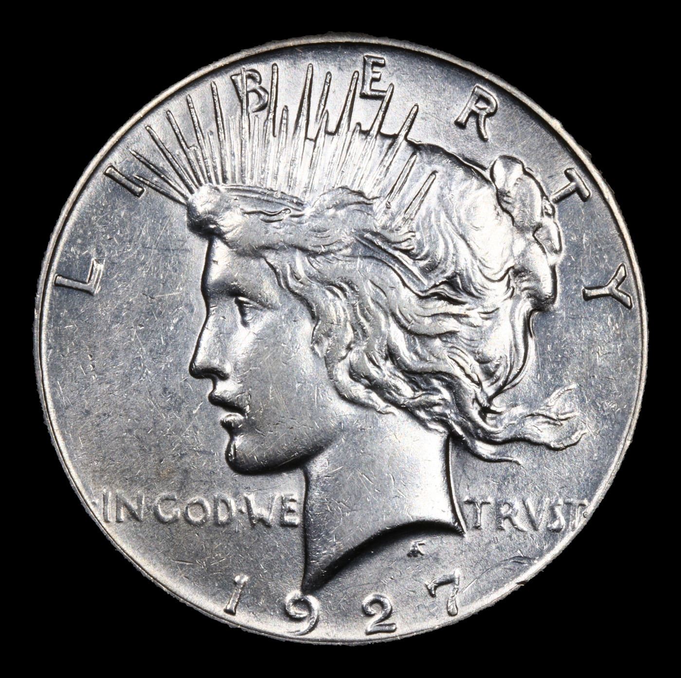 1927-p Peace Dollar $1 Grades Choice AU/BU Slider. The 27-p is the big sleeper of numismatics in my opinion. It has the 2nd lowest mintage in the whole Peace dollar series. Lower than the 34-s, the 21-p, yet it does not command its proper value. Good coin to own multiple of and save, in my opinion, but if you've been coming to our auctions for a while you will have seen that this has always been my opinion.
