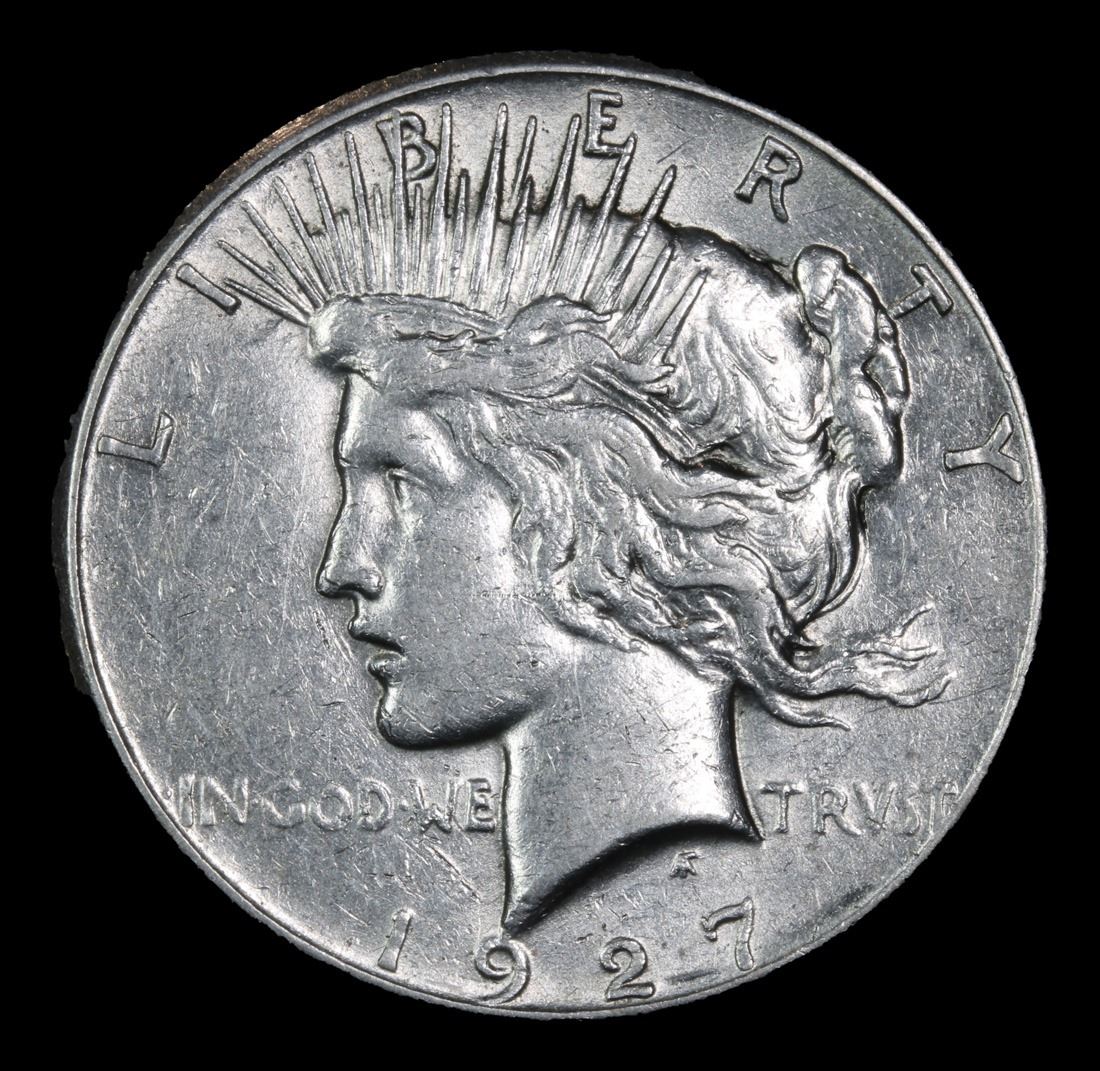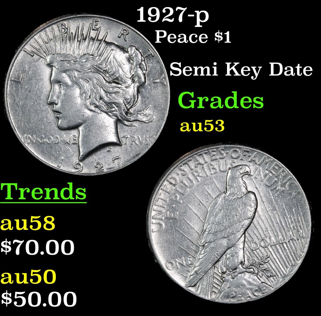 1927-p Semi Key Date . Peace Dollar $1 Grades Select AU. The 27-p is the big sleeper of numismatics in my opinion. It has the 2nd lowest mintage in the whole Peace dollar series. Lower than the 34-s, the 21-p, yet it does not command its proper value. Good coin to own multiple of and save, in my opinion, but if you've been coming to our auctions for a while you will have seen that this has always been my opinion.