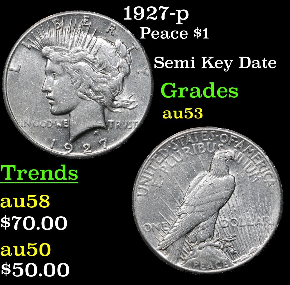 1927-p Semi Key Date . Peace Dollar $1 Grades Select AU. The 27-p is the big sleeper of numismatics in my opinion. It has the 2nd lowest mintage in the whole Peace dollar series. Lower than the 34-s, the 21-p, yet it does not command its proper value. Good coin to own multiple of and save, in my opinion, but if you've been coming to our auctions for a while you will have seen that this has always been my opinion.