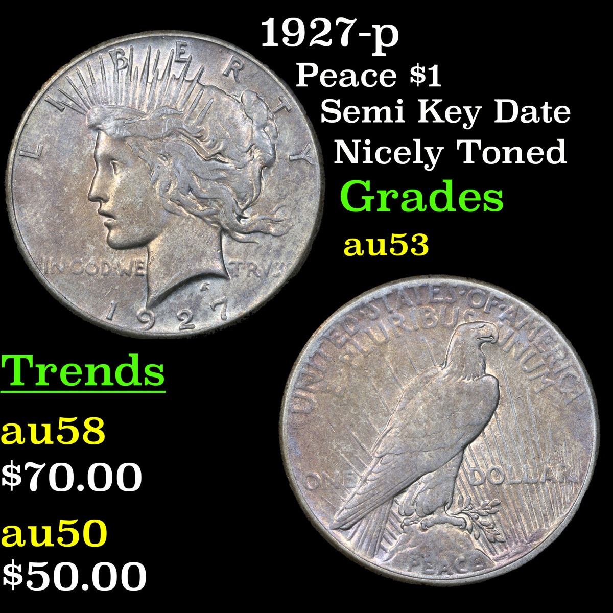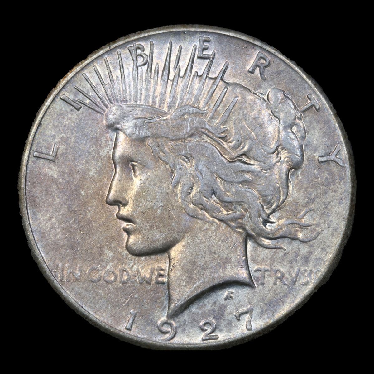 1927-p Semi Key Date Nicely Toned Peace Dollar $1 Grades Select AU. The 27-p is the big sleeper of numismatics in my opinion. It has the 2nd lowest mintage in the whole Peace dollar series. Lower than the 34-s, the 21-p, yet it does not command its proper value. Good coin to own multiple of and save, in my opinion, but if you've been coming to our auctions for a while you will have seen that this has always been my opinion.