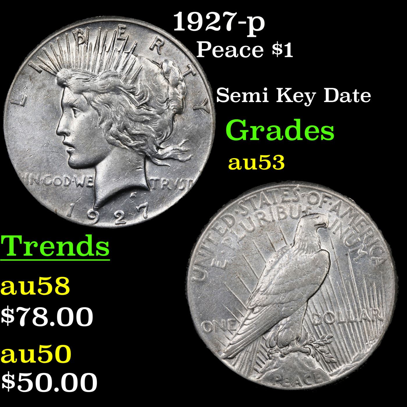 1927-p Peace Dollar $1 Grades Select AU. The 27-p is the big sleeper of numismatics in my opinion. It has the 2nd lowest mintage in the whole Peace dollar series. Lower than the 34-s, the 21-p, yet it does not command its proper value. Good coin to own multiple of and save, in my opinion, but if you've been coming to our auctions for a while you will have seen that this has always been my opinion.