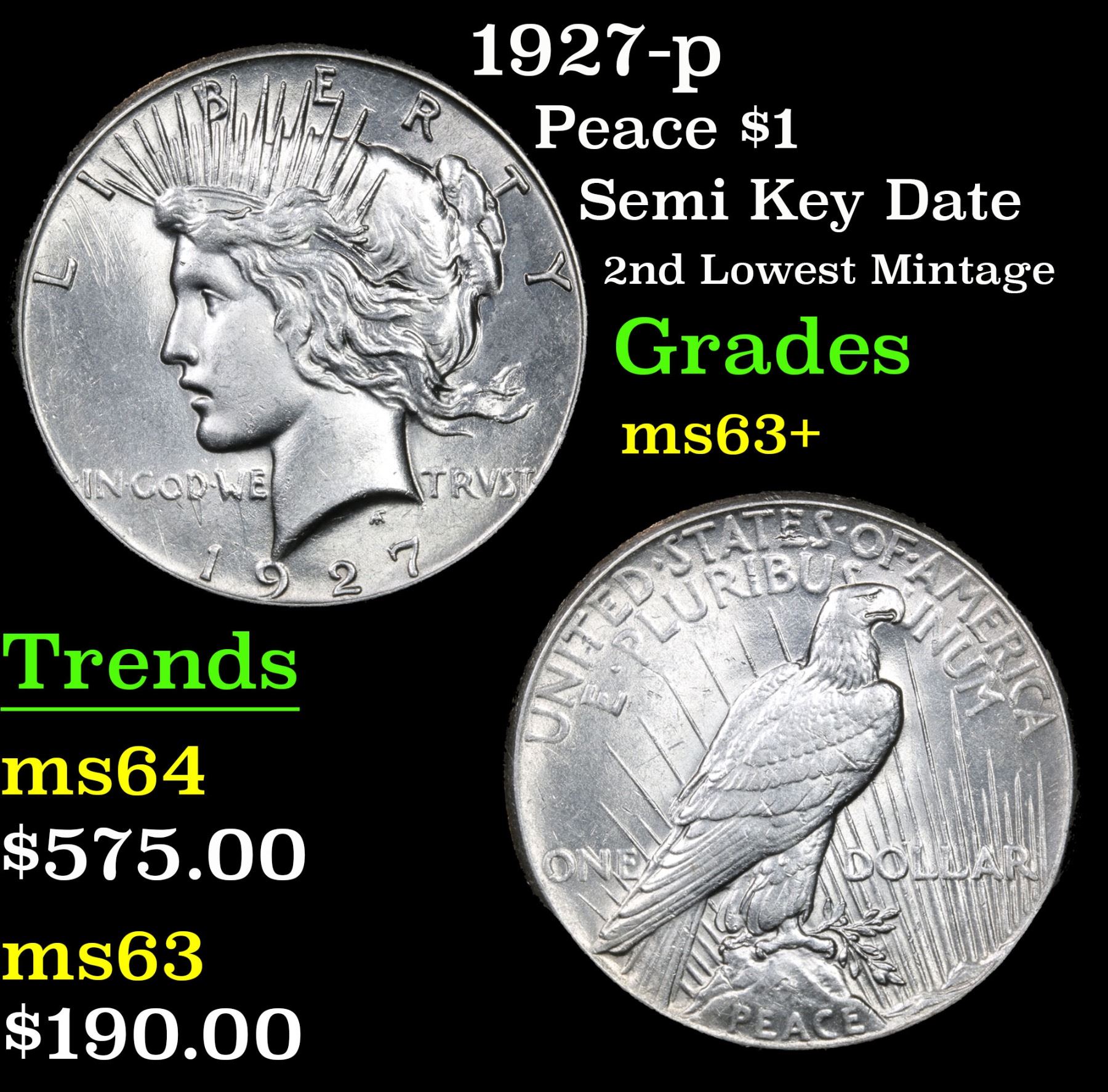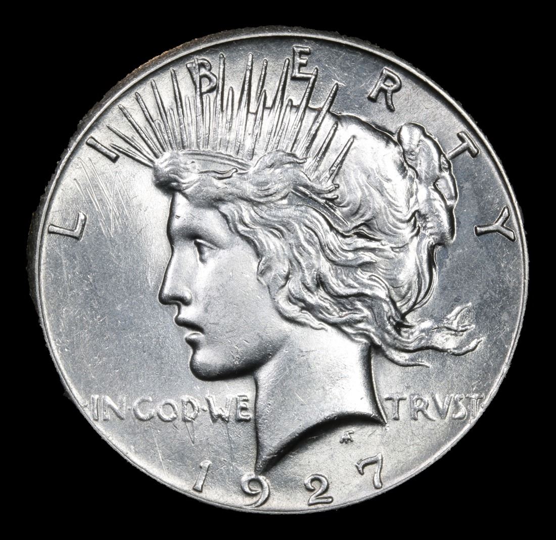 1927-p Peace Dollar $1 Grades Select+ Unc. The 27-p is the big sleeper of numismatics in my opinion. It has the 2nd lowest mintage in the whole Peace dollar series. Lower than the 34-s, the 21-p, yet it does not command its proper value. Good coin to own multiple of and save, in my opinion, but if you've been coming to our auctions for a while you will have seen that this has always been my opinion. Semi Key Date; 2nd Lowest Mintage