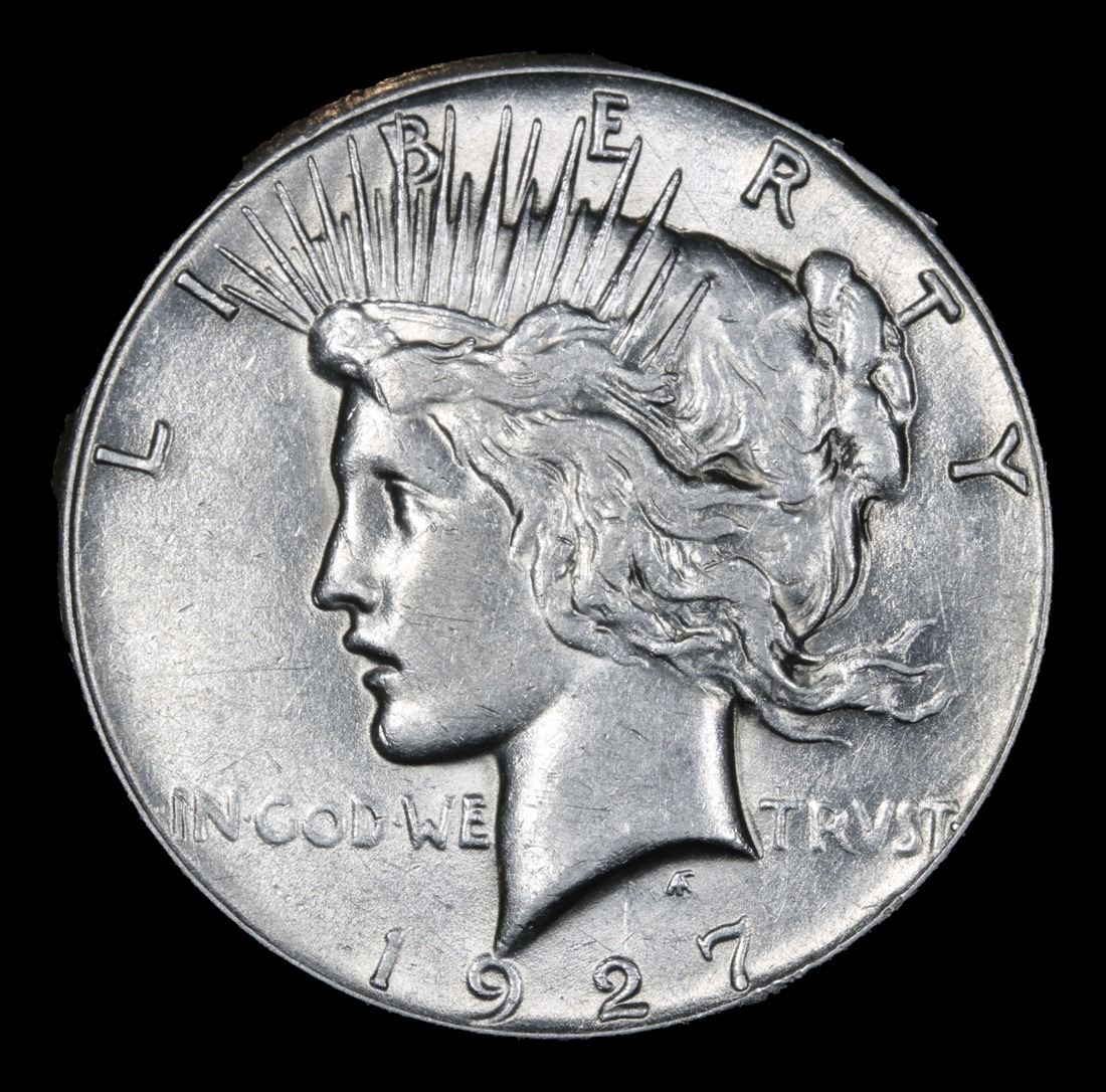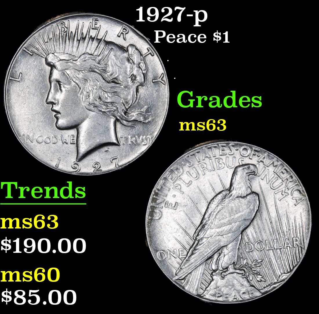 1927-p Peace Dollar $1 Grades Select Unc. The 27-p is the big sleeper of numismatics in my opinion. It has the 2nd lowest mintage in the whole Peace dollar series. Lower than the 34-s, the 21-p, yet it does not command its proper value. Good coin to own multiple of and save, in my opinion, but if you've been coming to our auctions for a while you will have seen that this has always been my opinion.