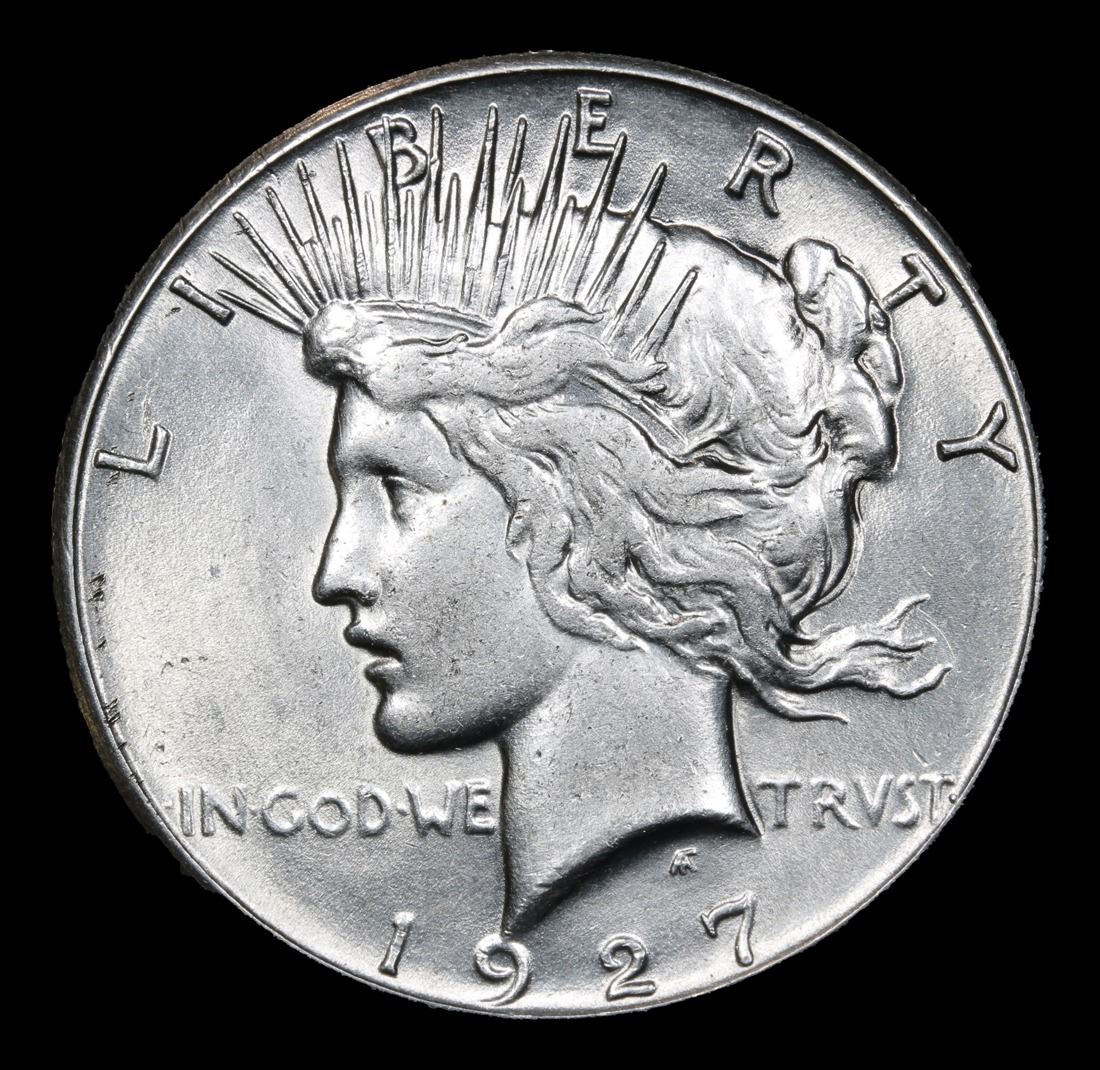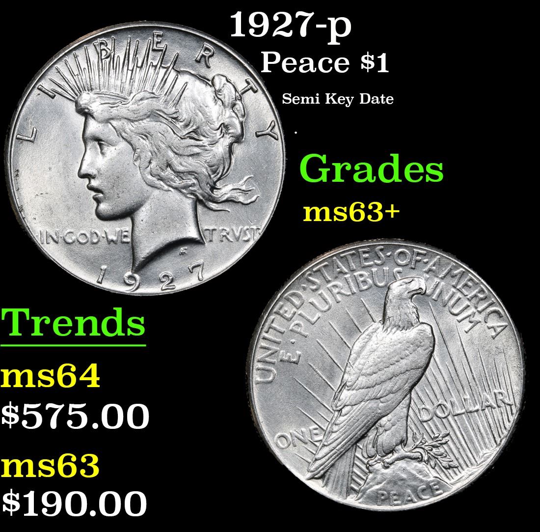 1927-p Semi Key Date . Peace Dollar $1 Grades Select+ Unc. The 27-p is the big sleeper of numismatics in my opinion. It has the 2nd lowest mintage in the whole Peace dollar series. Lower than the 34-s, the 21-p, yet it does not command its proper value. Good coin to own multiple of and save, in my opinion, but if you've been coming to our auctions for a while you will have seen that this has always been my opinion.