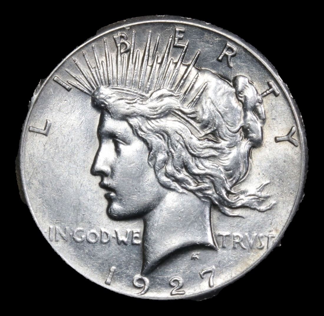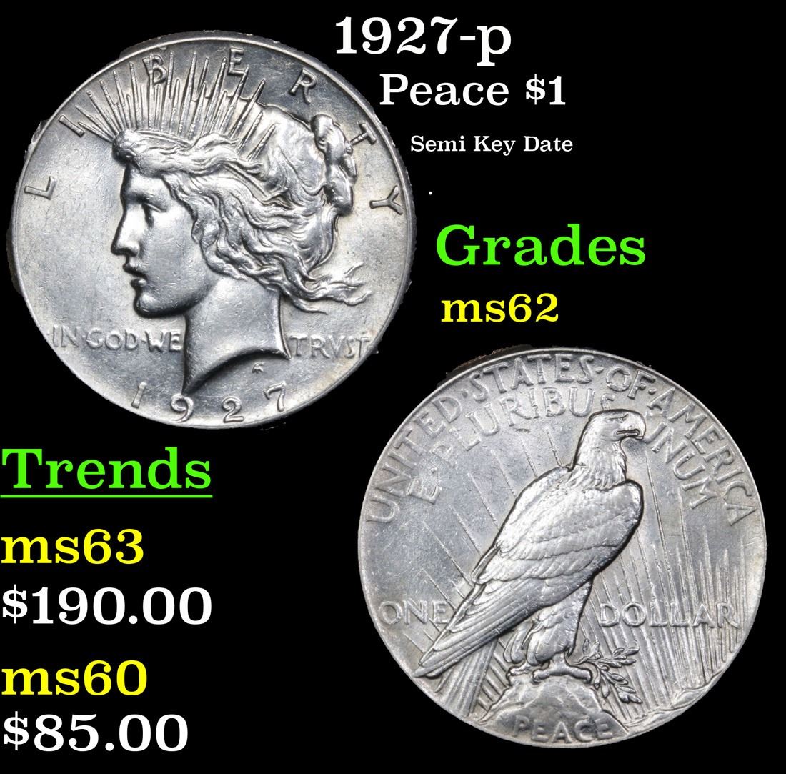 1927-p Semi Key Date . Peace Dollar $1 Grades Select Unc. The 27-p is the big sleeper of numismatics in my opinion. It has the 2nd lowest mintage in the whole Peace dollar series. Lower than the 34-s, the 21-p, yet it does not command its proper value. Good coin to own multiple of and save, in my opinion, but if you've been coming to our auctions for a while you will have seen that this has always been my opinion.