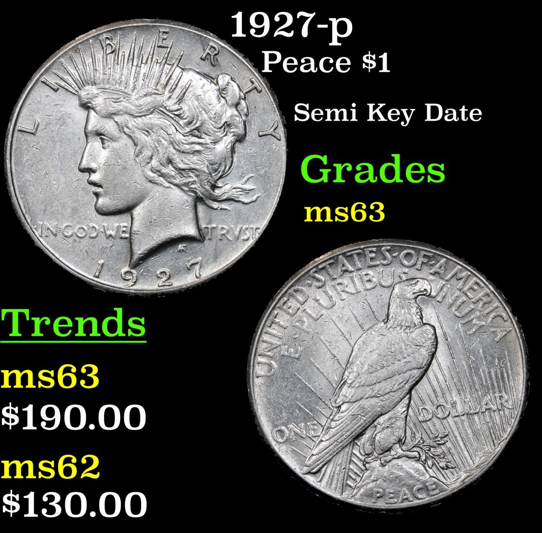1927-p Semi Key Date . Peace Dollar $1 Grades Select Unc. The 27-p is the big sleeper of numismatics in my opinion. It has the 2nd lowest mintage in the whole Peace dollar series. Lower than the 34-s, the 21-p, yet it does not command its proper value. Good coin to own multiple of and save, in my opinion, but if you've been coming to our auctions for a while you will have seen that this has always been my opinion.