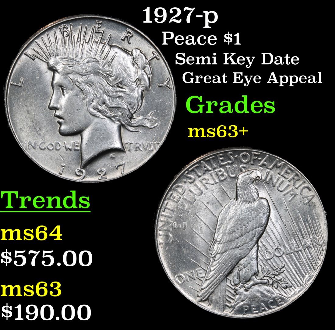 1927-p Semi Key Date Great Eye Appeal Peace Dollar $1 Grades Select+ Unc. The 27-p is the big sleeper of numismatics in my opinion. It has the 2nd lowest mintage in the whole Peace dollar series. Lower than the 34-s, the 21-p, yet it does not command its proper value. Good coin to own multiple of and save, in my opinion, but if you've been coming to our auctions for a while you will have seen that this has always been my opinion.