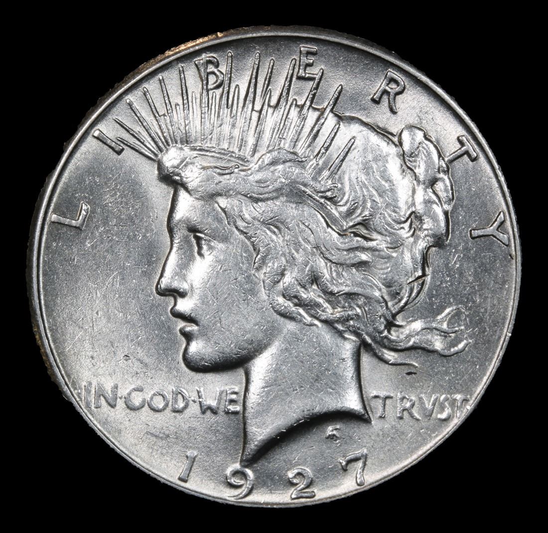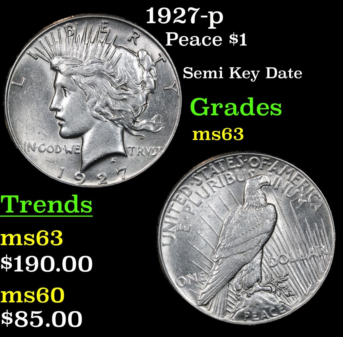 1927-p Semi Key Date . Peace Dollar $1 Grades Select Unc. The 27-p is the big sleeper of numismatics in my opinion. It has the 2nd lowest mintage in the whole Peace dollar series. Lower than the 34-s, the 21-p, yet it does not command its proper value. Good coin to own multiple of and save, in my opinion, but if you've been coming to our auctions for a while you will have seen that this has always been my opinion.