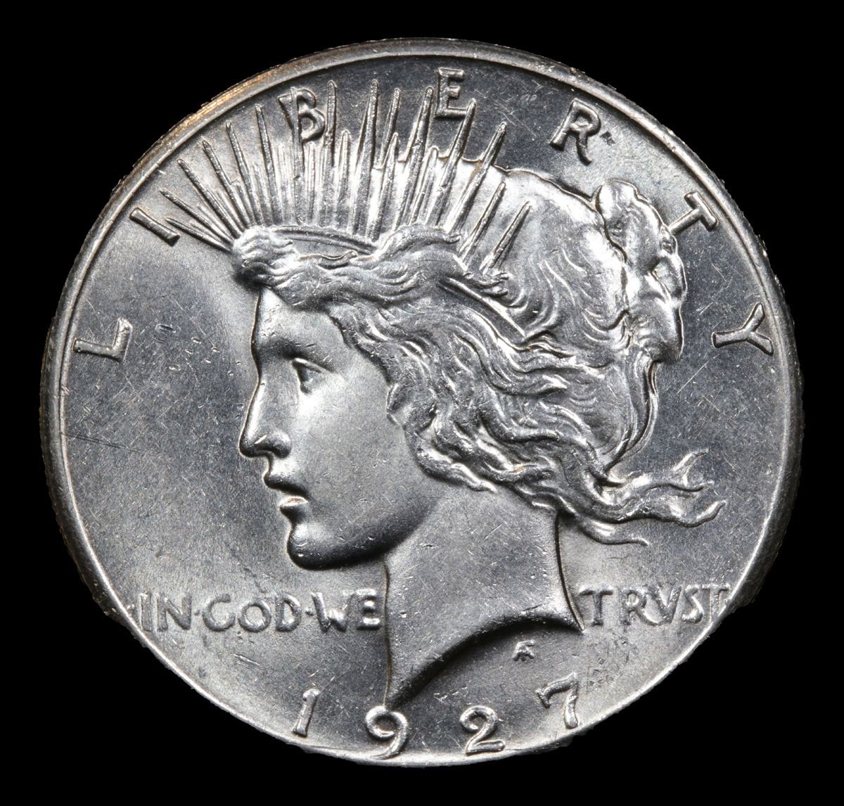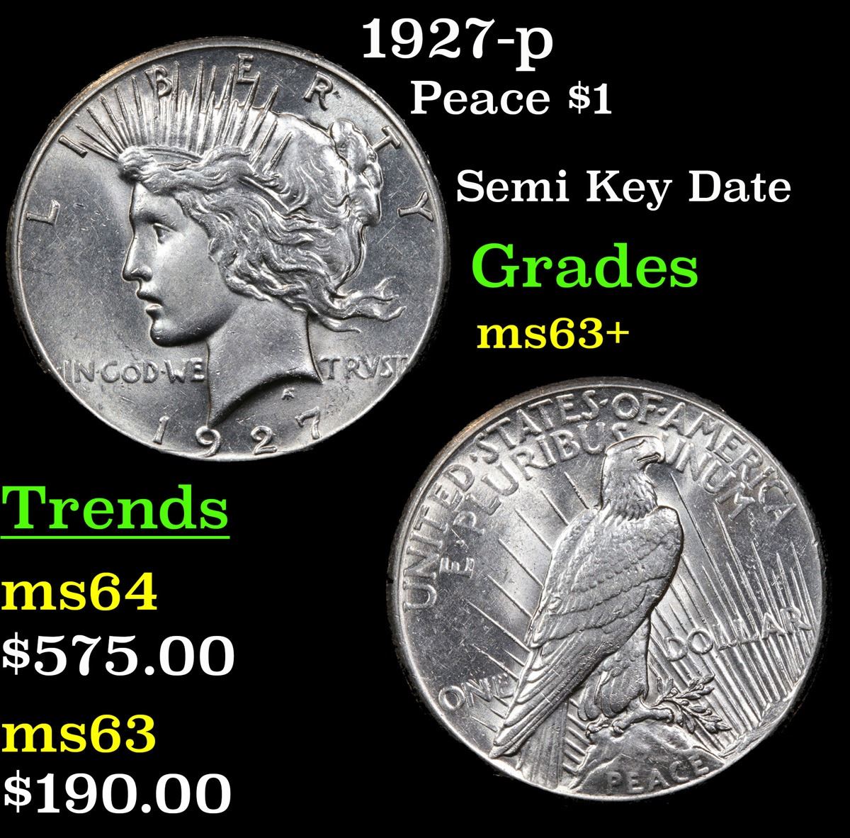1927-p Peace Dollar $1 Grades Select+ Unc. The 27-p is the big sleeper of numismatics in my opinion. It has the 2nd lowest mintage in the whole Peace dollar series. Lower than the 34-s, the 21-p, yet it does not command its proper value. Good coin to own multiple of and save, in my opinion, but if you've been coming to our auctions for a while you will have seen that this has always been my opinion.