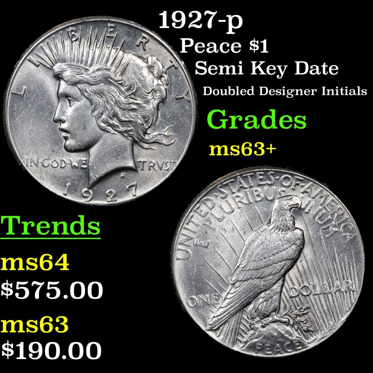 1927-p Peace Dollar $1 Grades Select+ Unc. The 27-p is the big sleeper of numismatics in my opinion. It has the 2nd lowest mintage in the whole Peace dollar series. Lower than the 34-s, the 21-p, yet it does not command its proper value. Good coin to own multiple of and save, in my opinion, but if you've been coming to our auctions for a while you will have seen that this has always been my opinion.