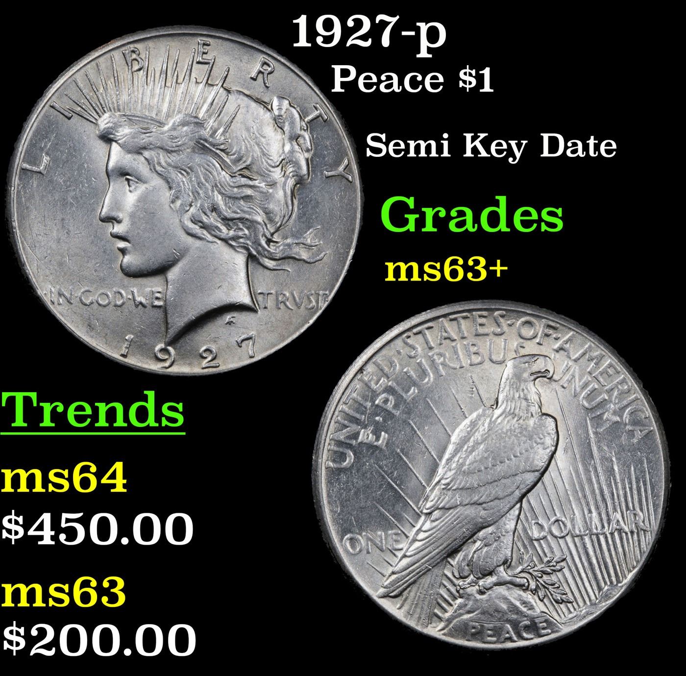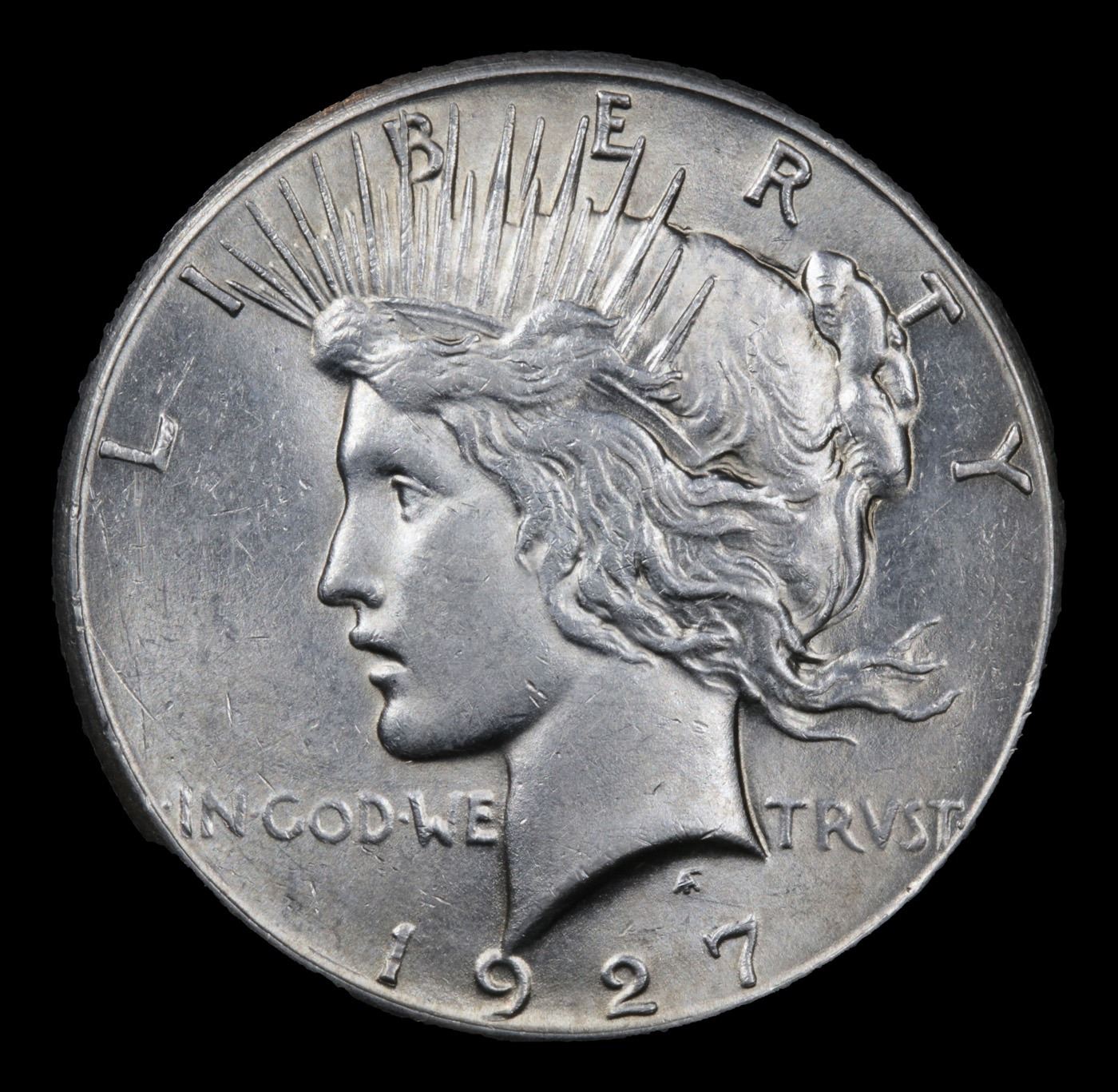 1927-p Peace Dollar $1 Grades Select+ Unc. The 27-p is the big sleeper of numismatics in my opinion. It has the 2nd lowest mintage in the whole Peace dollar series. Lower than the 34-s, the 21-p, yet it does not command its proper value. Good coin to own multiple of and save, in my opinion, but if you've been coming to our auctions for a while you will have seen that this has always been my opinion.