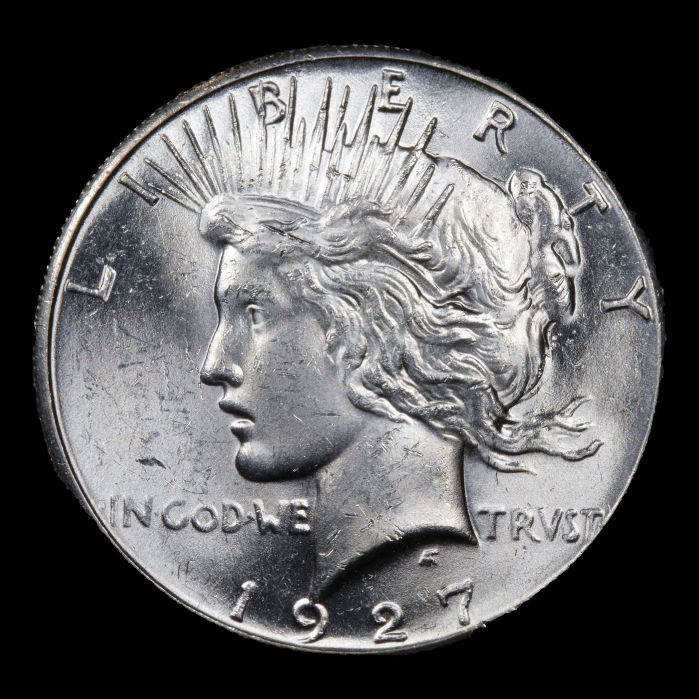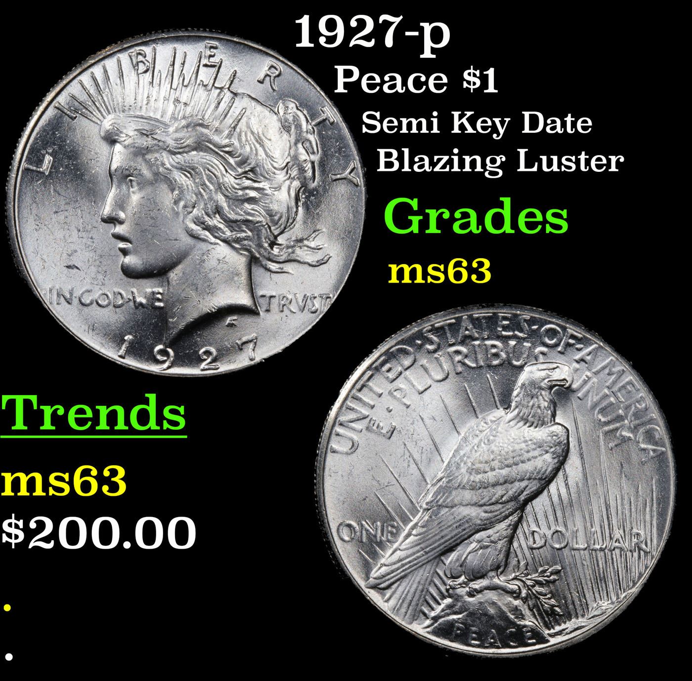 1927-p Peace Dollar $1 Grades Select Unc. The 27-p is the big sleeper of numismatics in my opinion. It has the 2nd lowest mintage in the whole Peace dollar series. Lower than the 34-s, the 21-p, yet it does not command its proper value. Good coin to own multiple of and save, in my opinion, but if you've been coming to our auctions for a while you will have seen that this has always been my opinion.