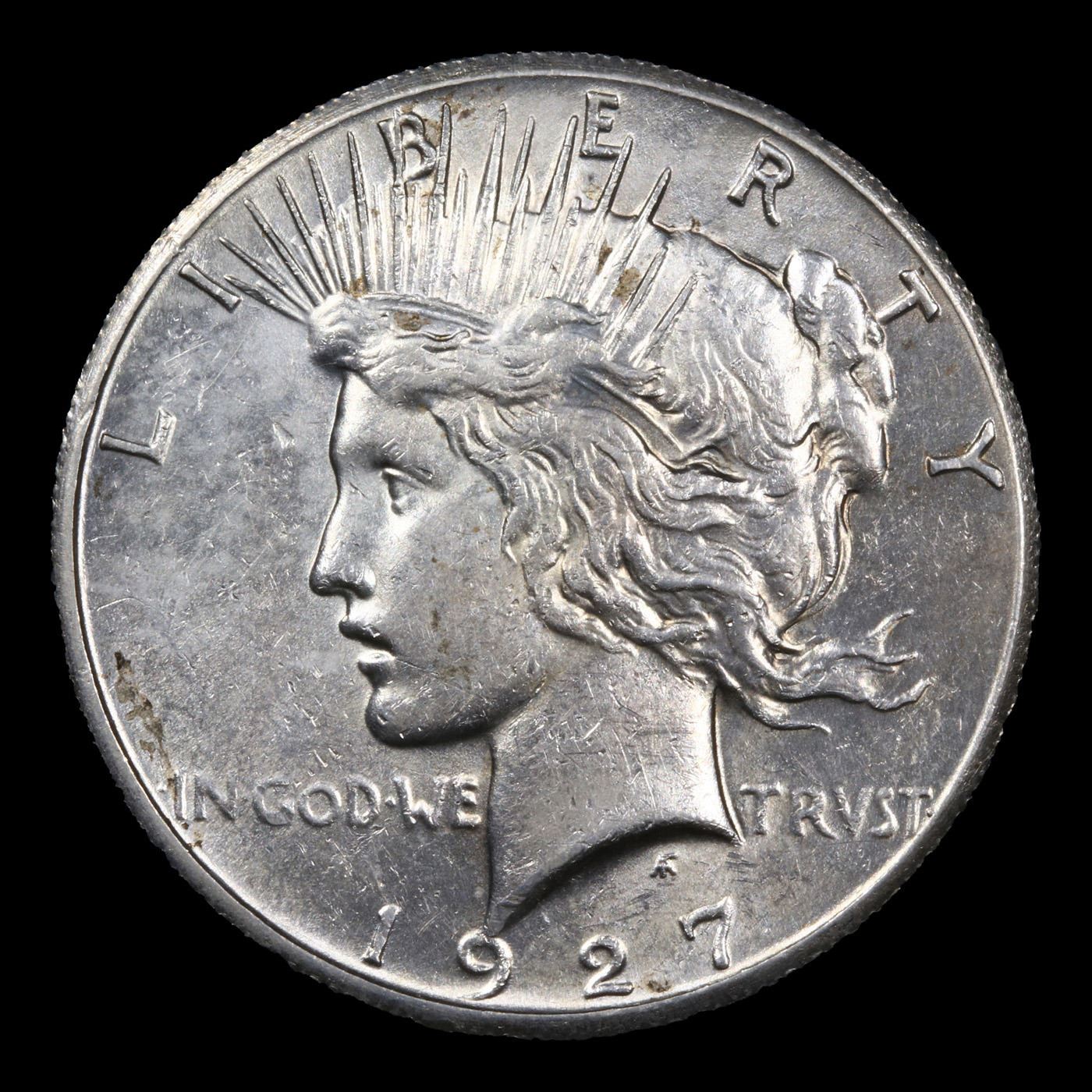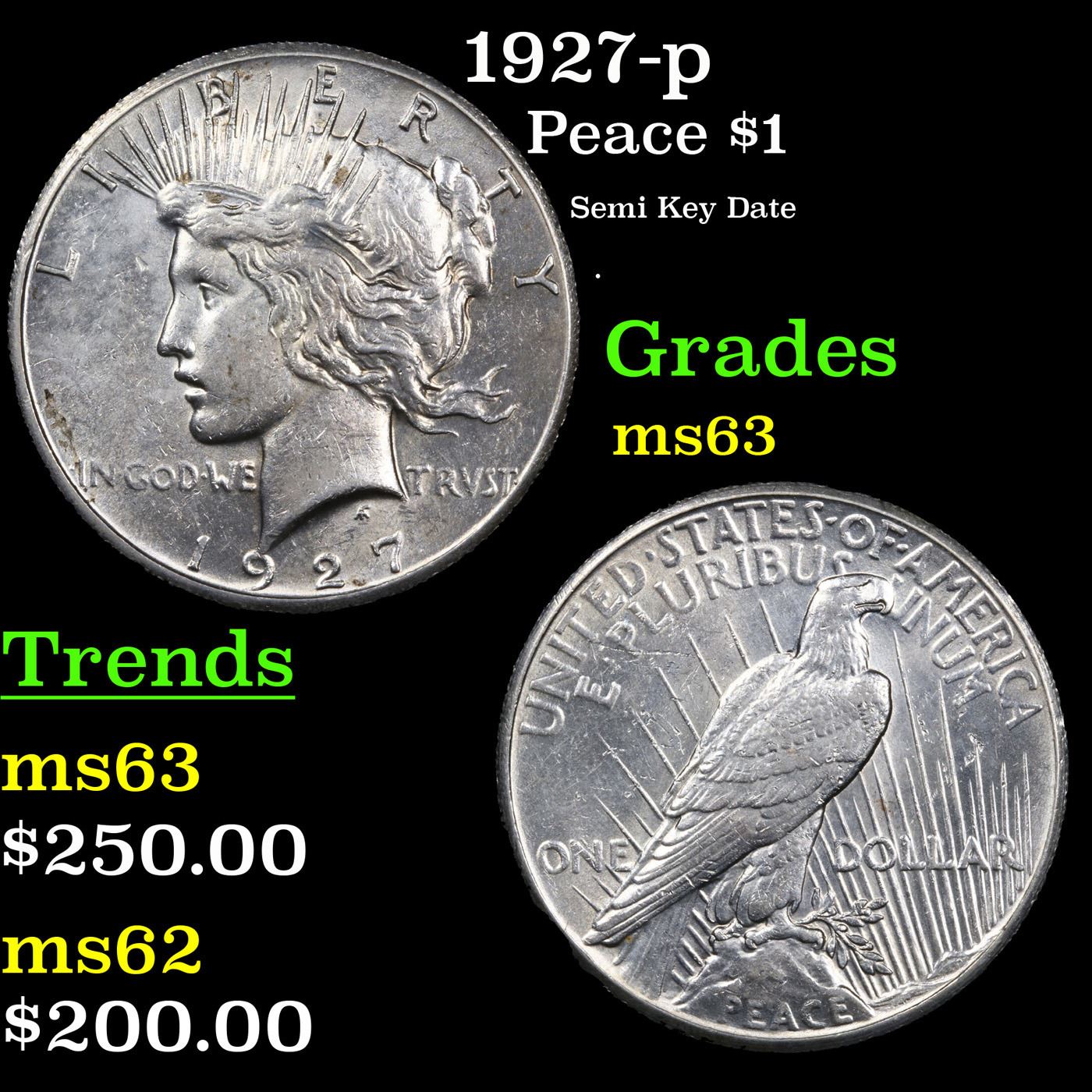 1927-p Peace Dollar $1 Grades Select Unc. The 27-p is the big sleeper of numismatics in my opinion. It has the 2nd lowest mintage in the whole Peace dollar series. Lower than the 34-s, the 21-p, yet it does not command its proper value. Good coin to own multiple of and save, in my opinion, but if you've been coming to our auctions for a while you will have seen that this has always been my opinion.
