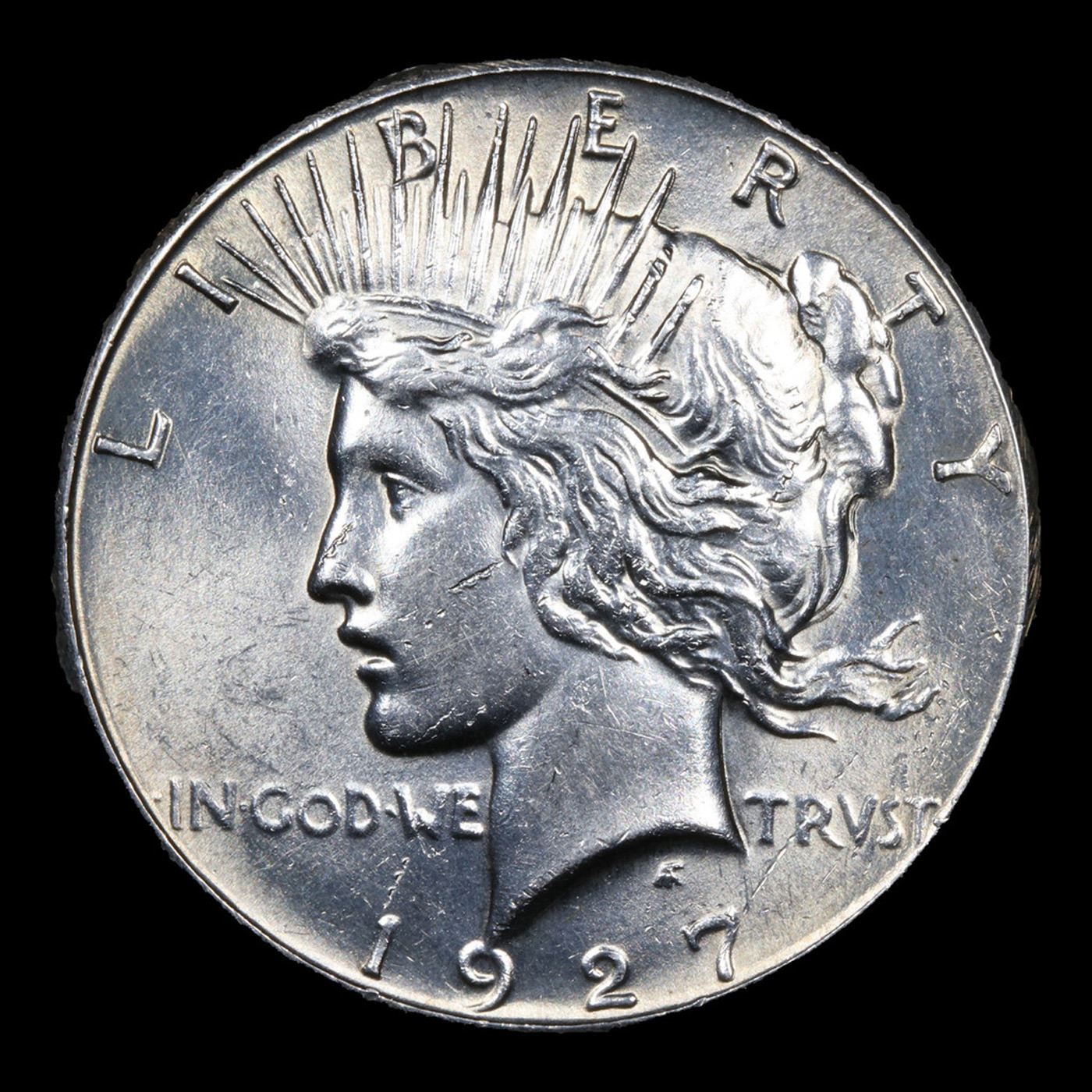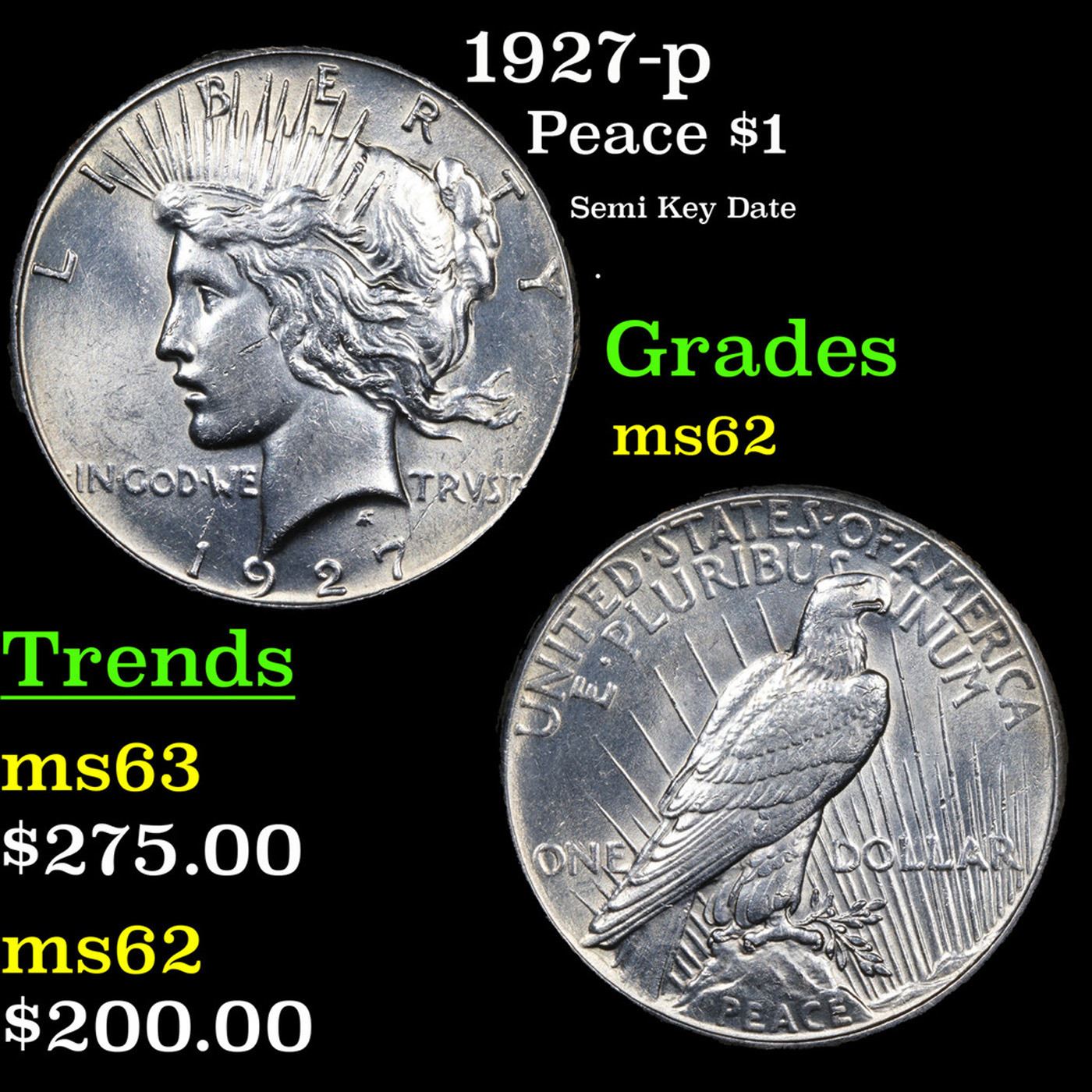 1927-p Peace Dollar $1 Grades Select Unc. The 27-p is the big sleeper of numismatics in my opinion. It has the 2nd lowest mintage in the whole Peace dollar series. Lower than the 34-s, the 21-p, yet it does not command its proper value. Good coin to own multiple of and save, in my opinion, but if you've been coming to our auctions for a while you will have seen that this has always been my opinion.
