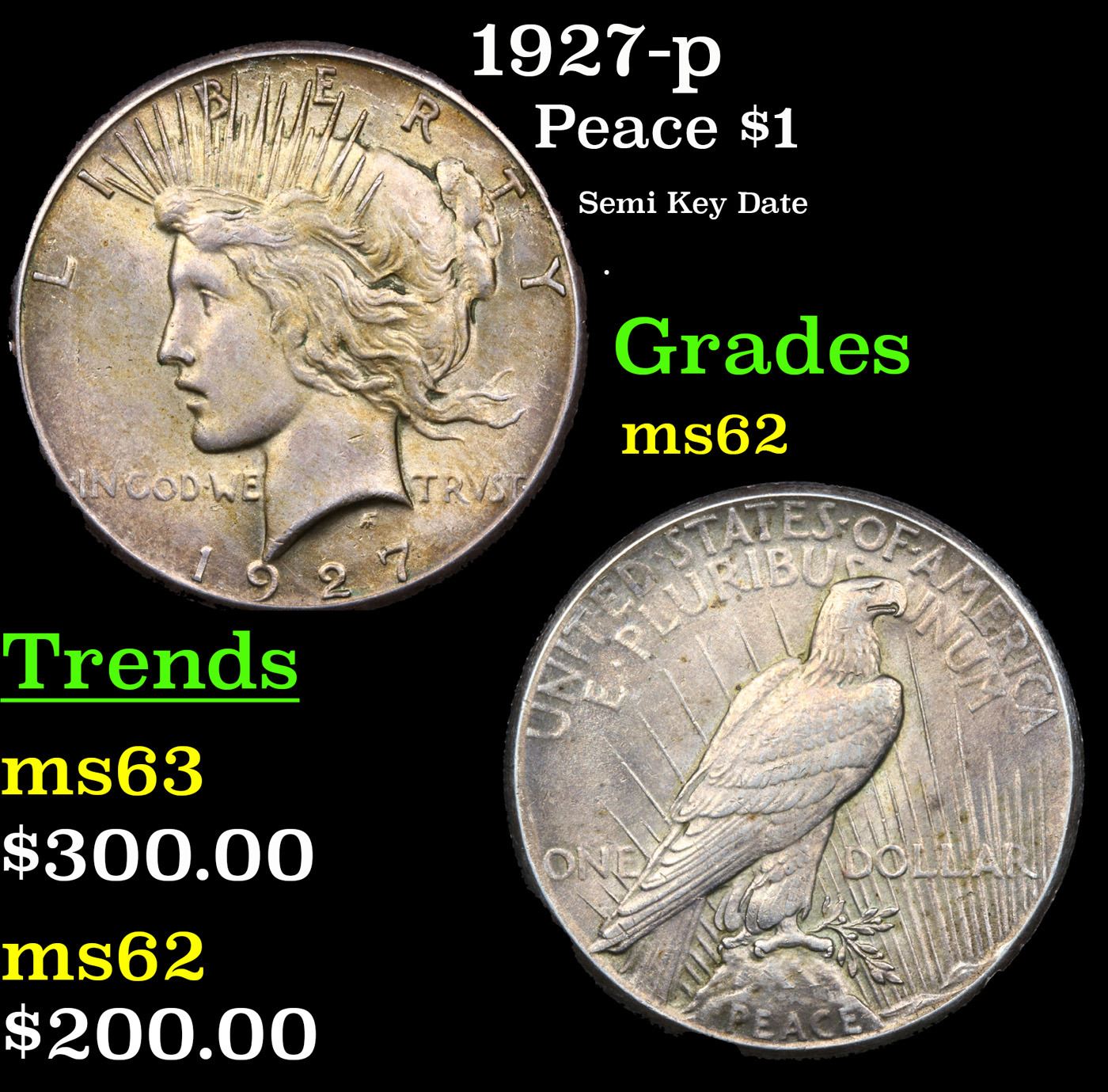 1927-p Peace Dollar $1 Grades Select Unc. The 27-p is the big sleeper of numismatics in my opinion. It has the 2nd lowest mintage in the whole Peace dollar series. Lower than the 34-s, the 21-p, yet it does not command its proper value. Good coin to own multiple of and save, in my opinion, but if you've been coming to our auctions for a while you will have seen that this has always been my opinion.