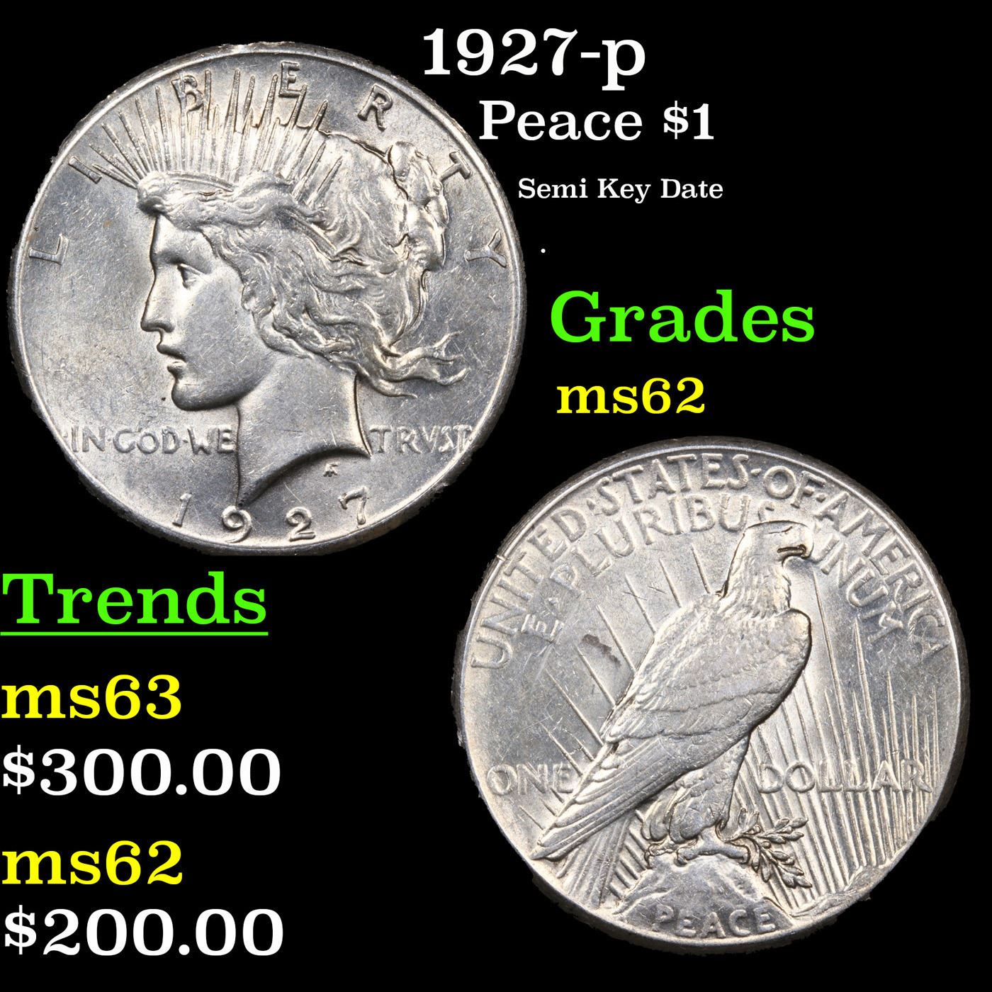 1927-p Peace Dollar $1 Grades Select Unc. The 27-p is the big sleeper of numismatics in my opinion. It has the 2nd lowest mintage in the whole Peace dollar series. Lower than the 34-s, the 21-p, yet it does not command its proper value. Good coin to own multiple of and save, in my opinion, but if you've been coming to our auctions for a while you will have seen that this has always been my opinion.