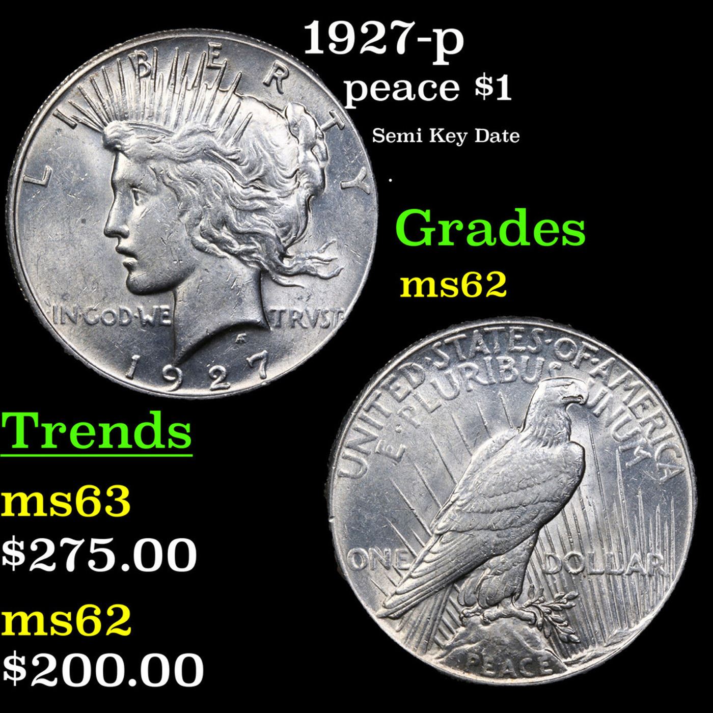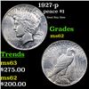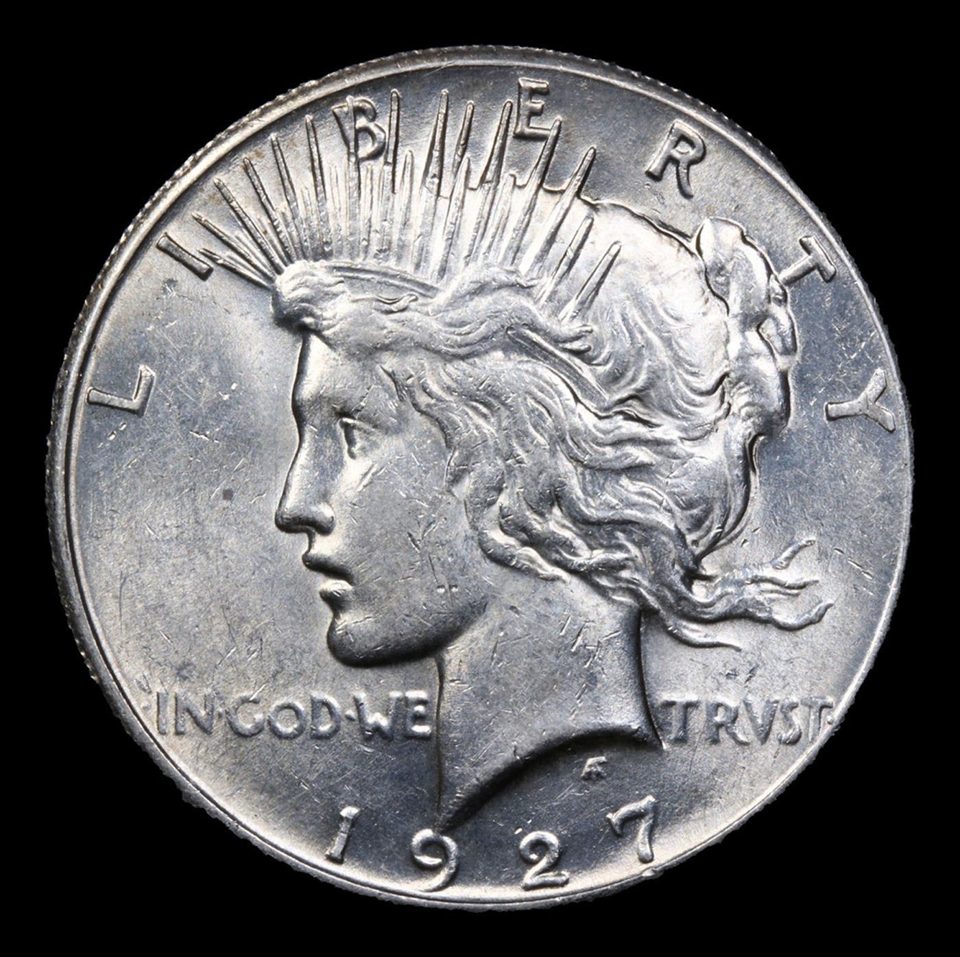 1927-p Peace Dollar $1 Grades Select Unc. The 27-p is the big sleeper of numismatics in my opinion. It has the 2nd lowest mintage in the whole Peace dollar series. Lower than the 34-s, the 21-p, yet it does not command its proper value. Good coin to own multiple of and save, in my opinion, but if you've been coming to our auctions for a while you will have seen that this has always been my opinion.