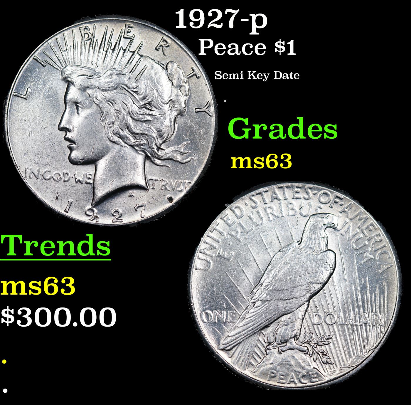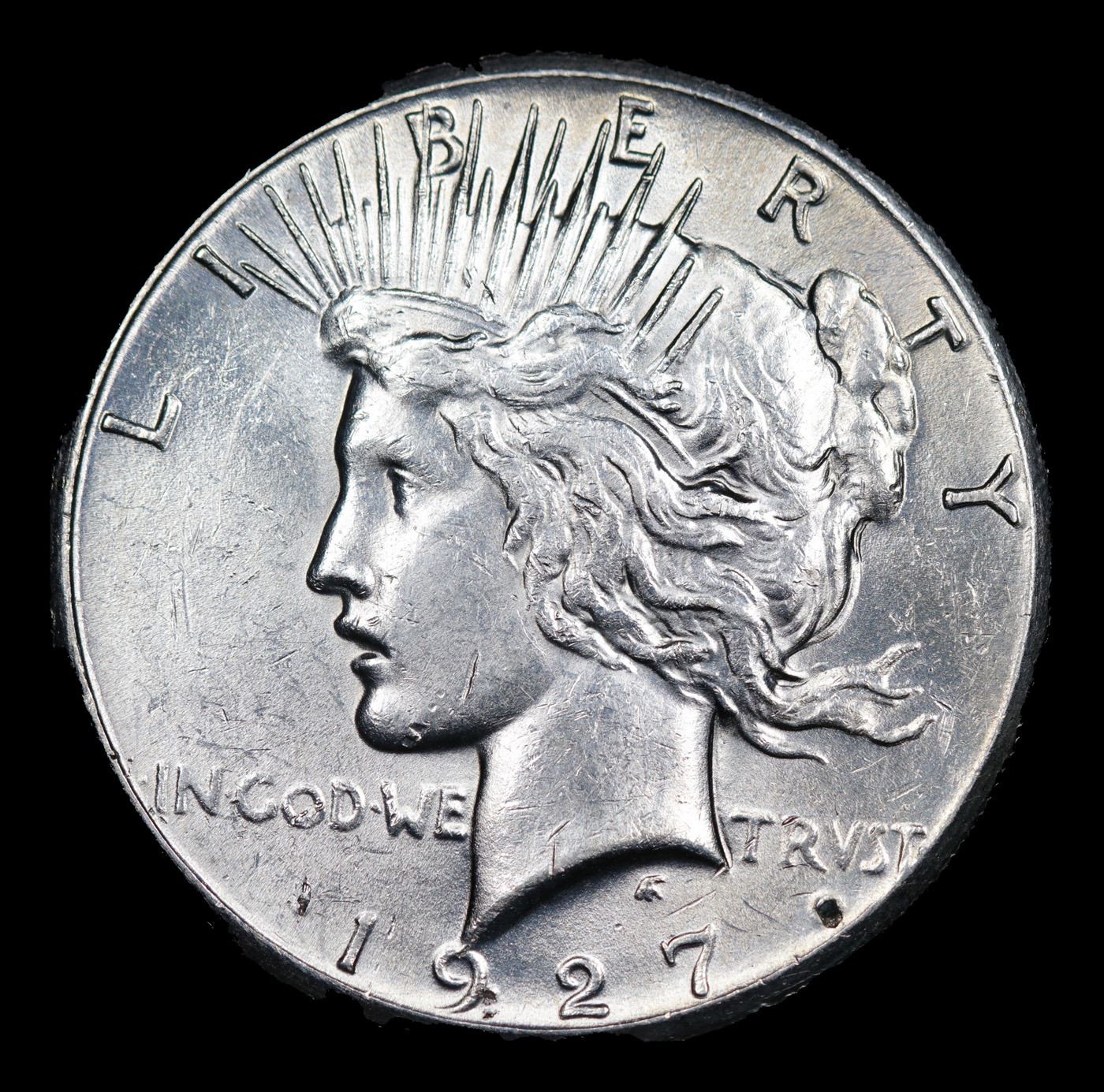 1927-p Peace Dollar $1 Grades Select Unc. The 27-p is the big sleeper of numismatics in my opinion. It has the 2nd lowest mintage in the whole Peace dollar series. Lower than the 34-s, the 21-p, yet it does not command its proper value. Good coin to own multiple of and save, in my opinion, but if you've been coming to our auctions for a while you will have seen that this has always been my opinion.