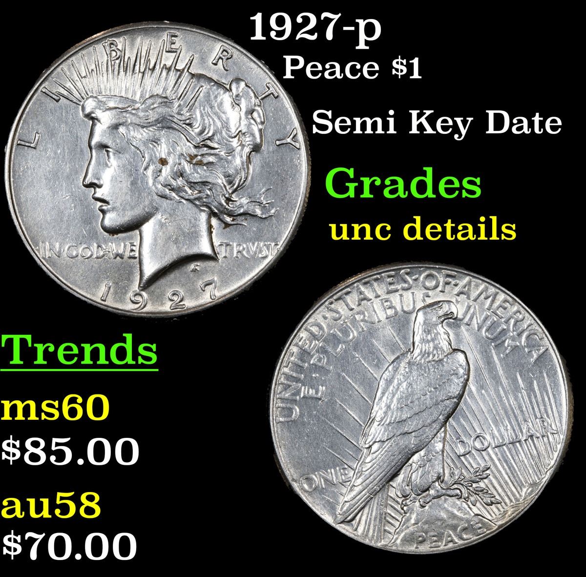 1927-p Semi Key Date . Peace Dollar $1 Grades Unc Details. The 27-p is the big sleeper of numismatics in my opinion. It has the 2nd lowest mintage in the whole Peace dollar series. Lower than the 34-s, the 21-p, yet it does not command its proper value. Good coin to own multiple of and save, in my opinion, but if you've been coming to our auctions for a while you will have seen that this has always been my opinion.